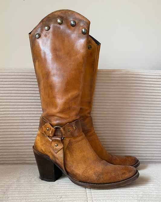 Lederstiefel cognac braun mit Nieten, Langschaft mit Absatz, Gr. 39