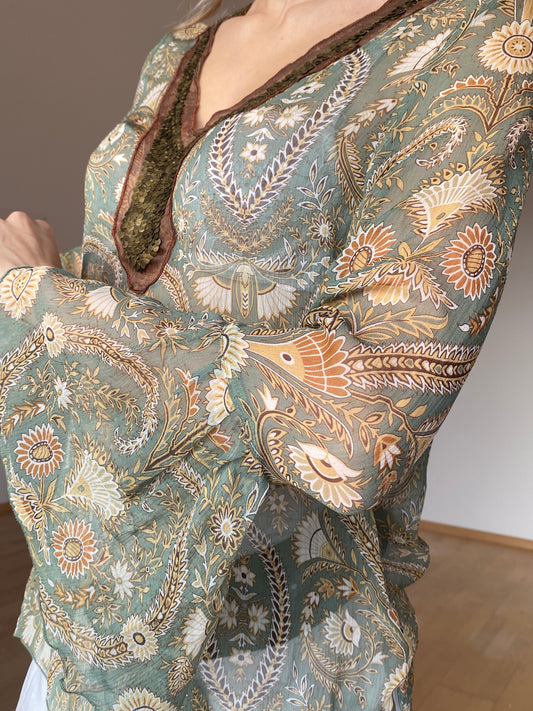 Fairy halbtransparente Seidenbluse Trompetenärmel, Pailletten, grün, M