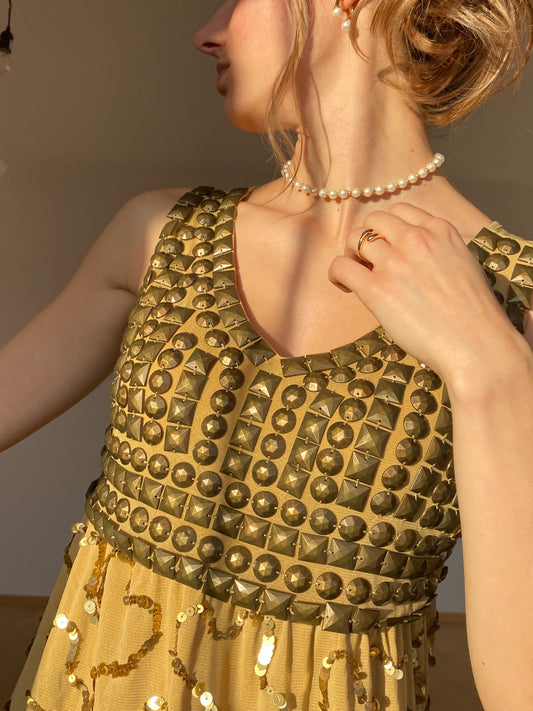 Goldenes Pailletten Top mit Nieten in Metall bronze, Mesh Stoff, M, L