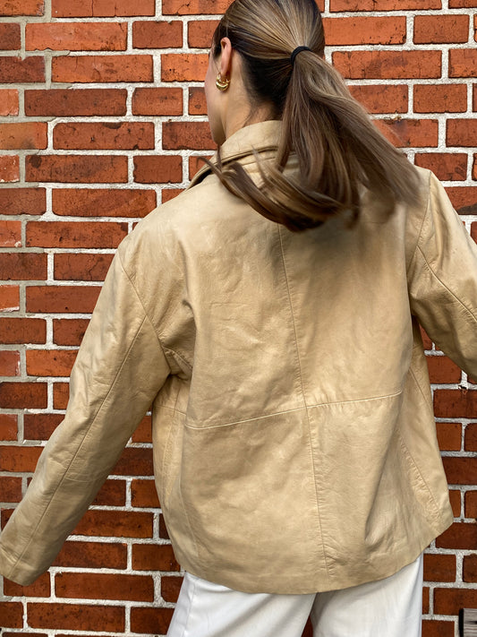 Retro Lederjacke Relaxed Fit in beige hellbraun, Reißverschluss und Kragen, oversize, S,M