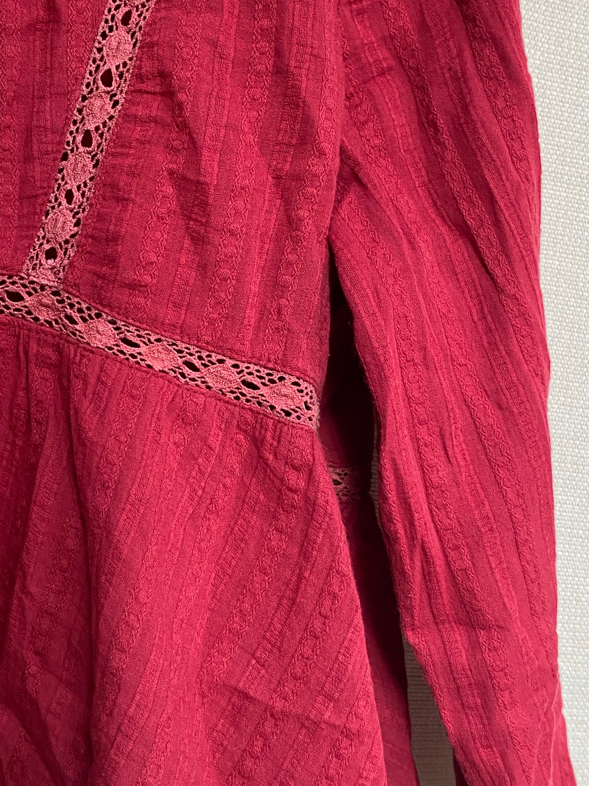 Wunderschön geschnittene lockere Bluse von altar'd state in weinrot dunkelrot mit Spitzenbordüre Verzierung, Trompeten Ärmlen, weit und Schößchen Stil mit V-Ausschnitt aus reiner Baumwolle in Gr. L