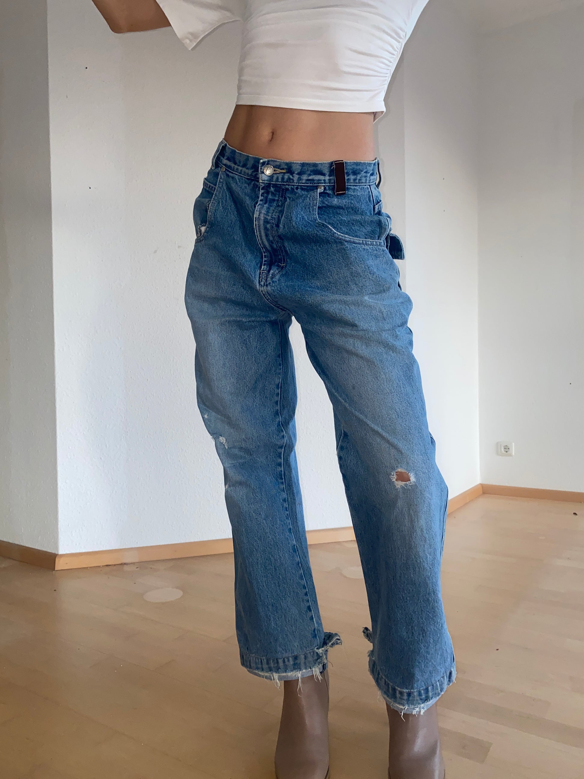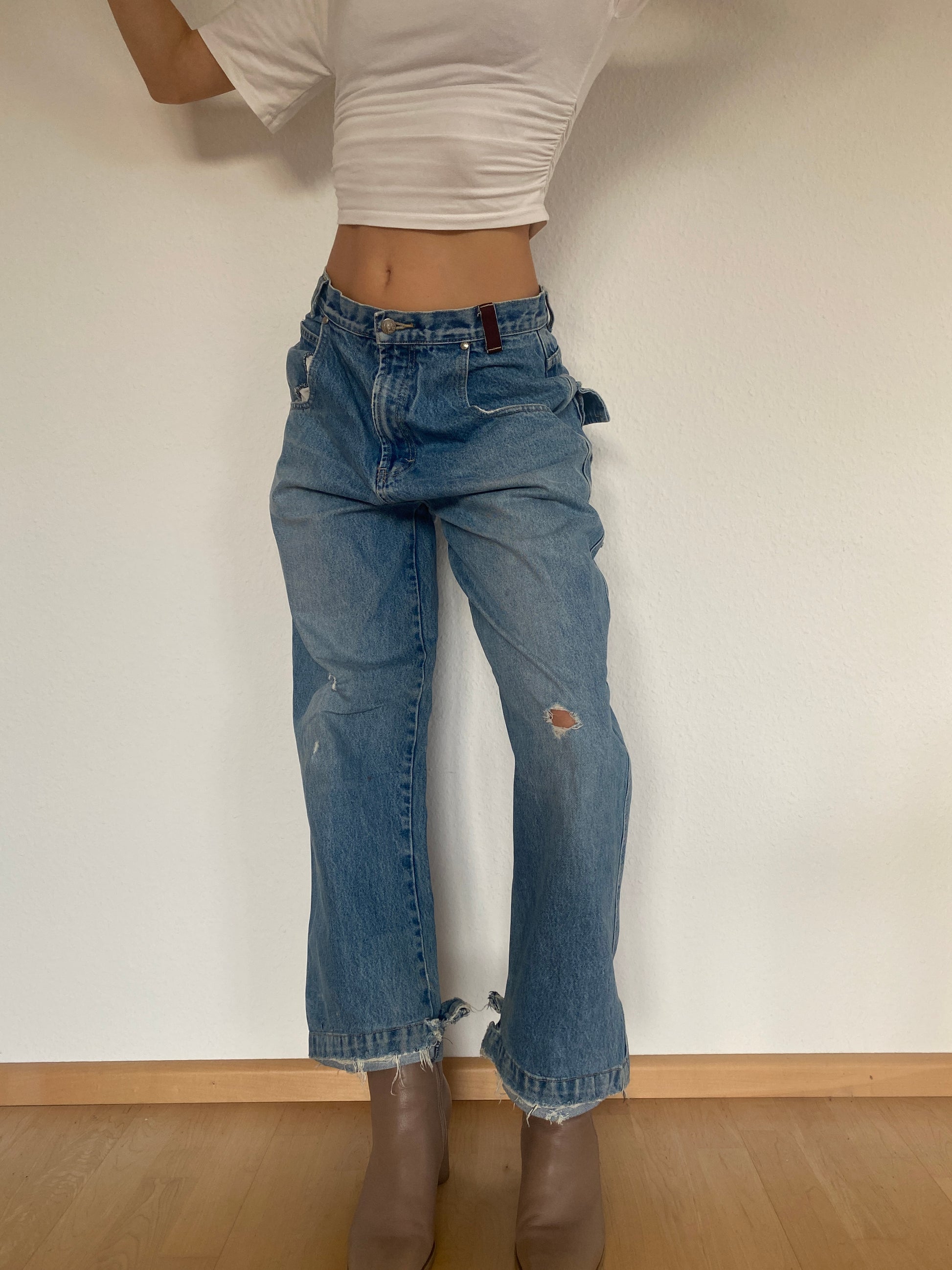 Gut erhalten, aber getragen mit Makel: kleiner Fleck siehe Foto am Oberschenkel. Unten am Saum ausgefranst; das gehört aber zum Stil. Wirkt umgenäht/gekürzt am Saum.