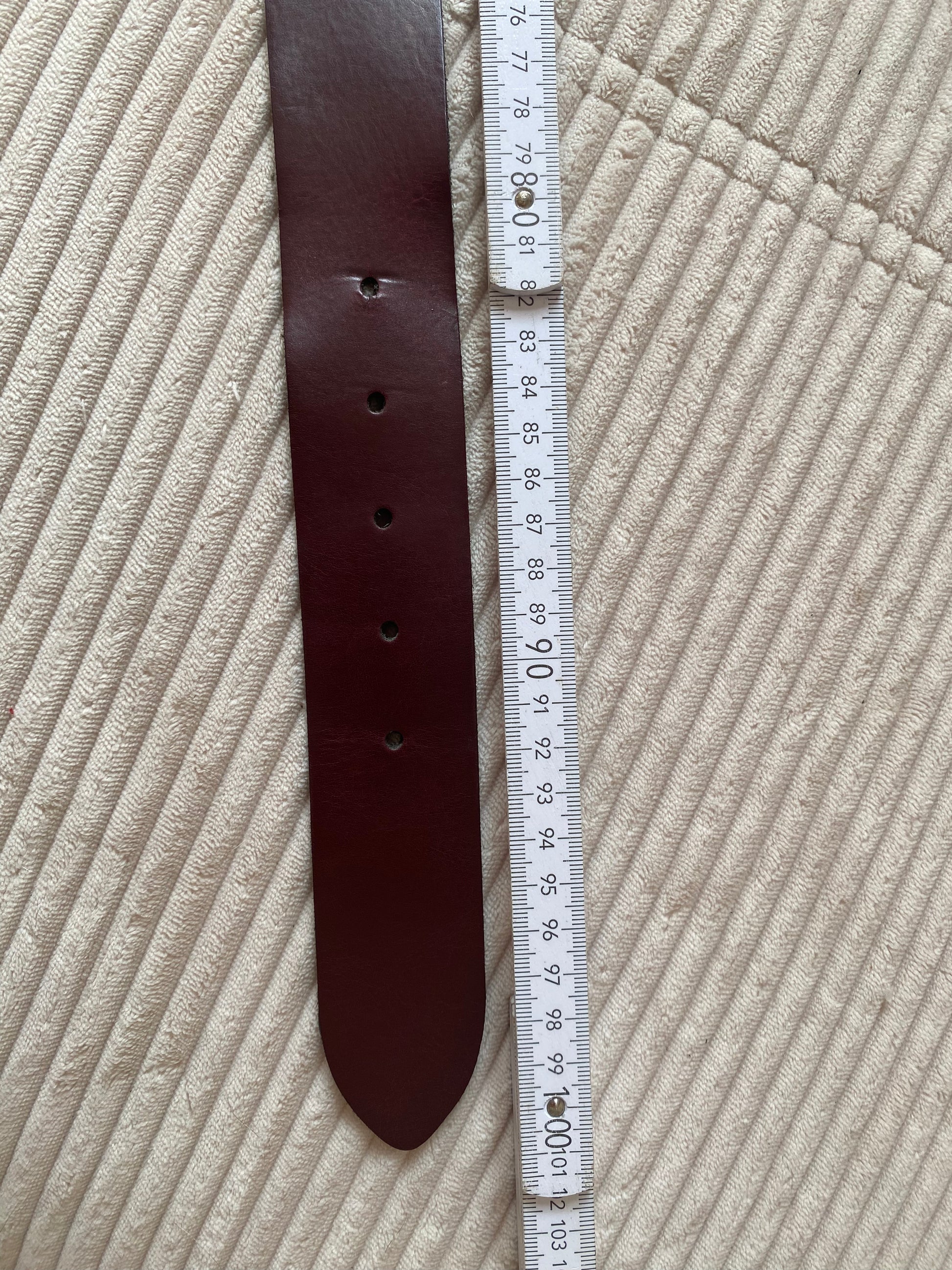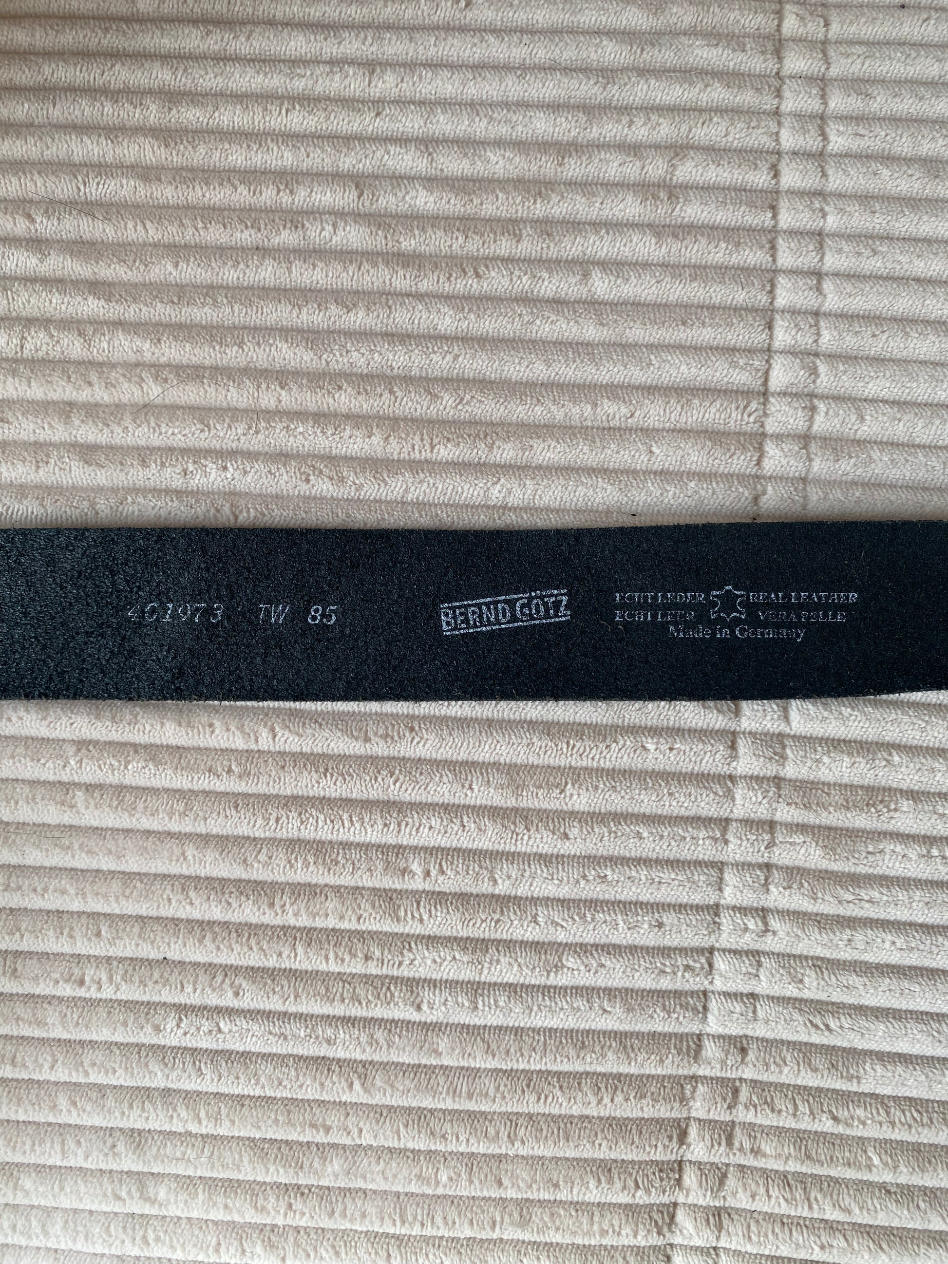 Hochwertiger breiter Echtleder Gürtel von Bernd Götz. Glattes Leder mit silberner Metallschnalle. Schlicht aber ausdrucksstark. Minimale Struktur im Leder. Abgestoßene used Optik der Schnalle; rechteckig mit oval abgerundeten Ecken.