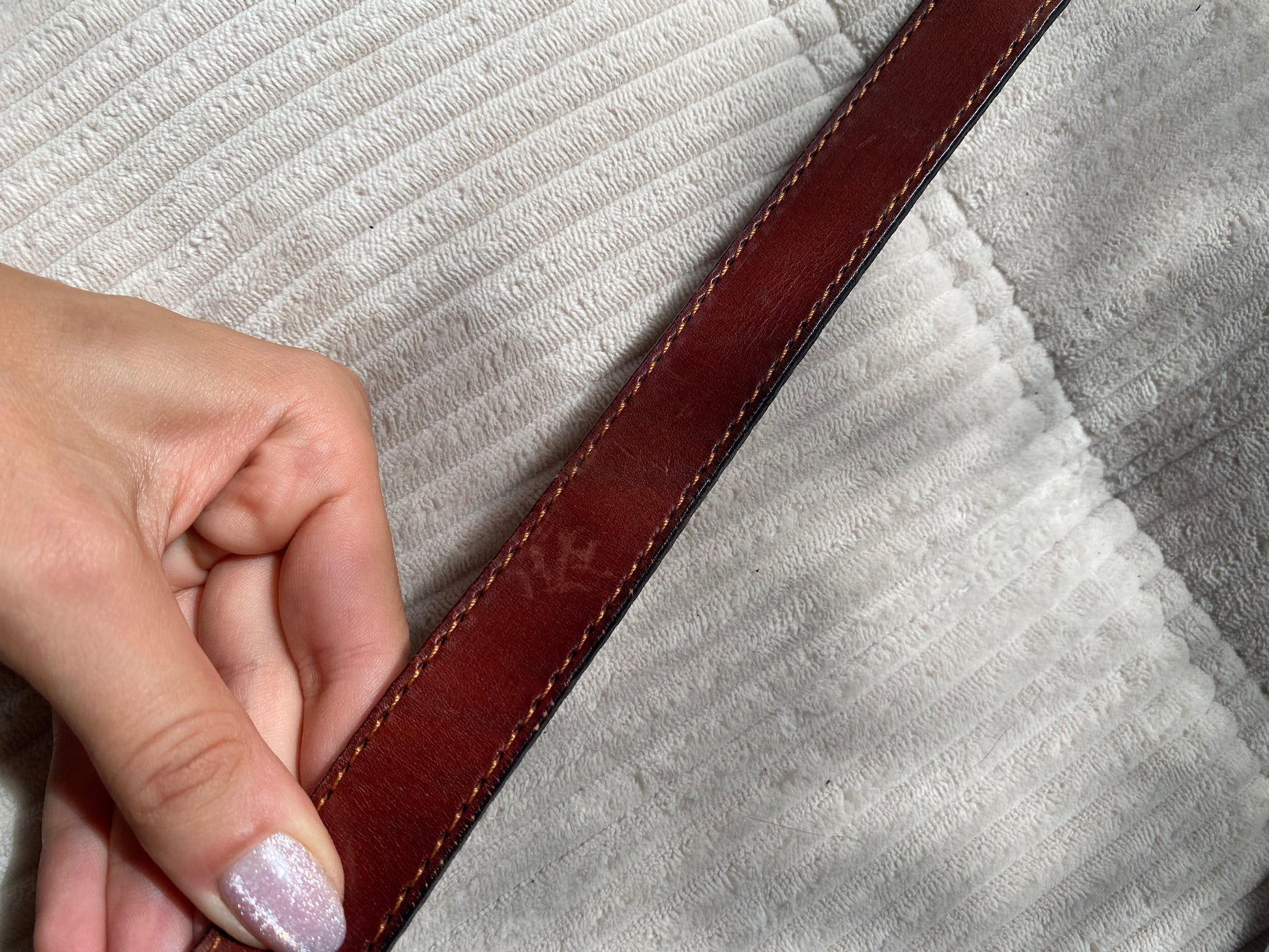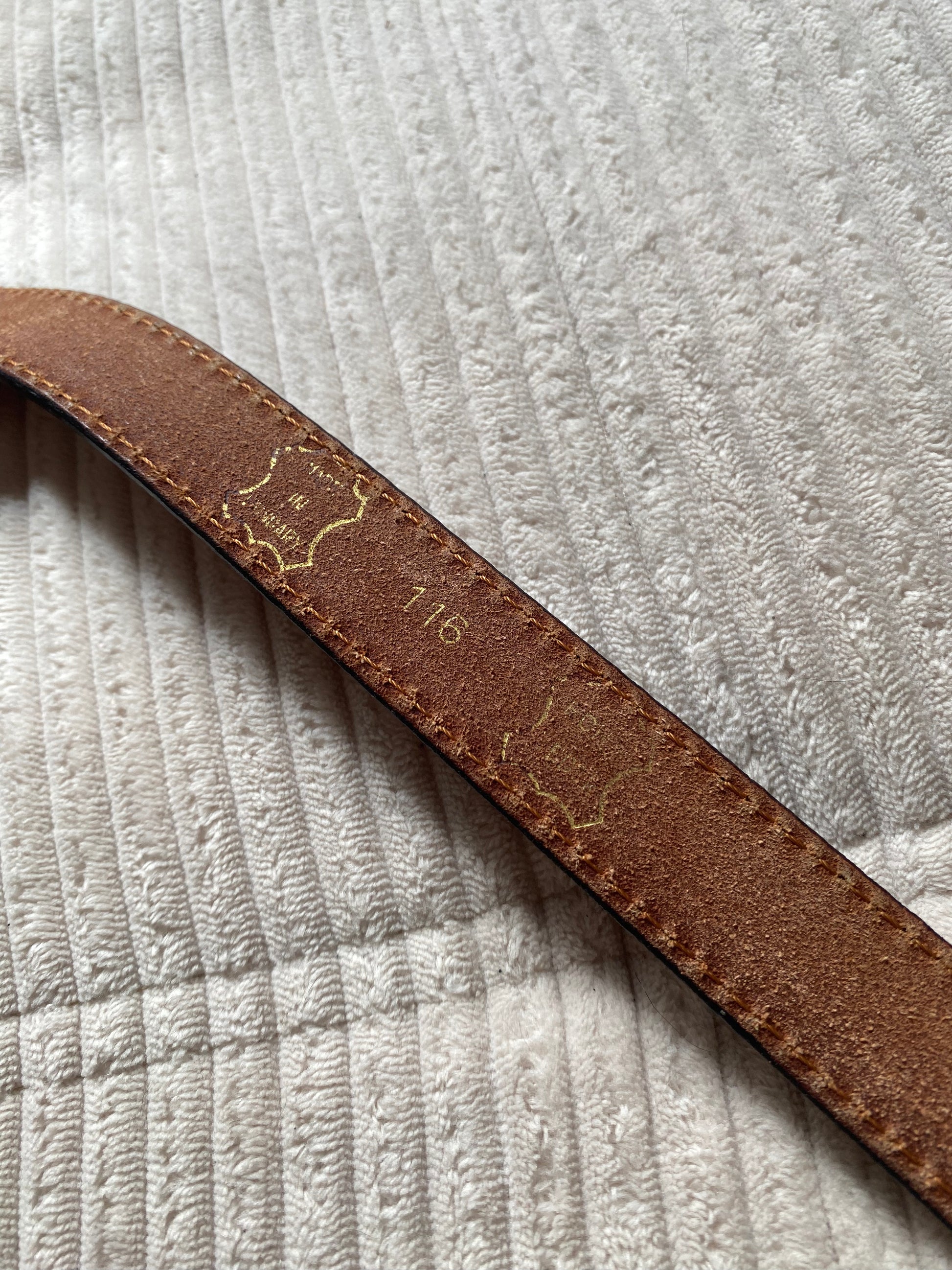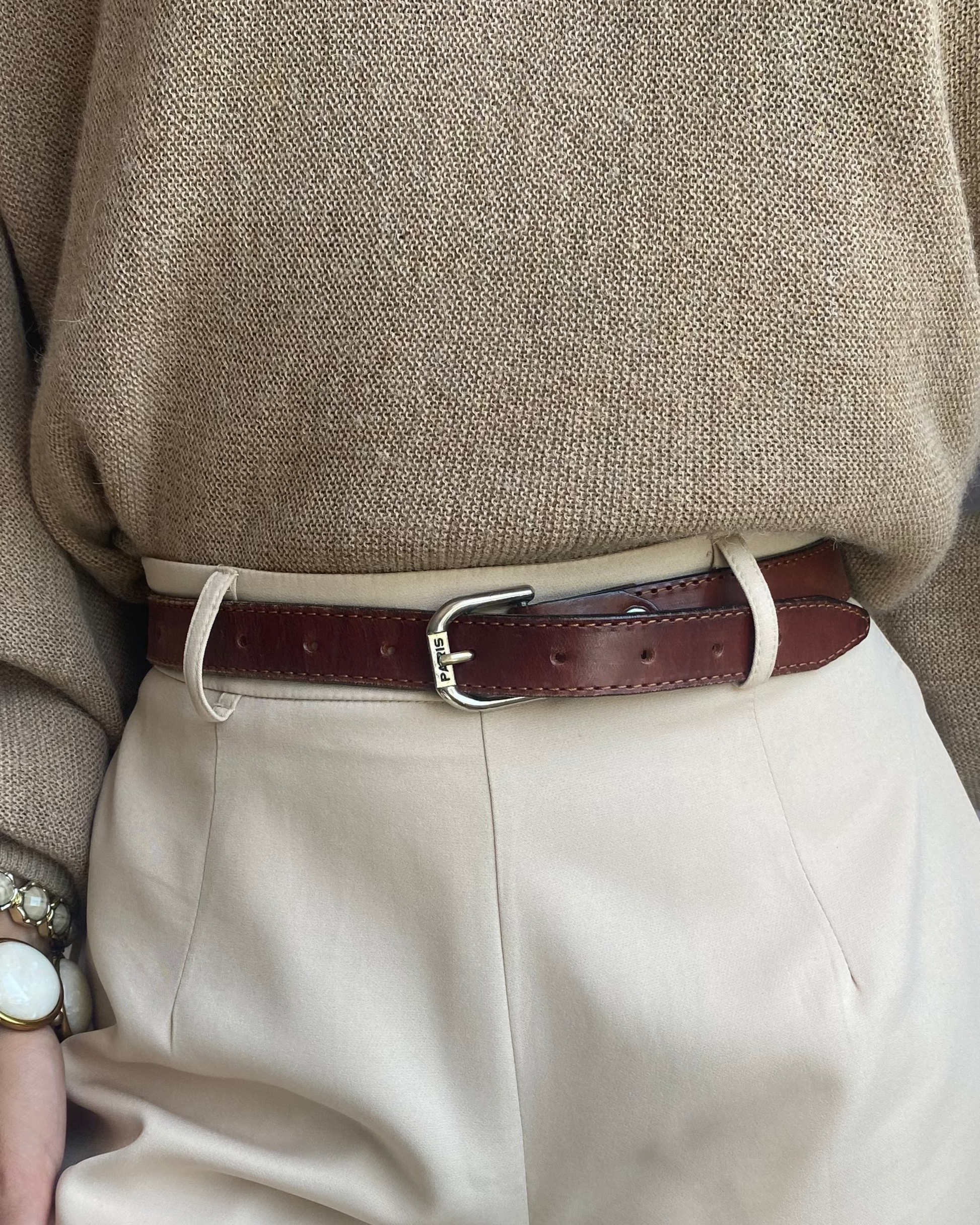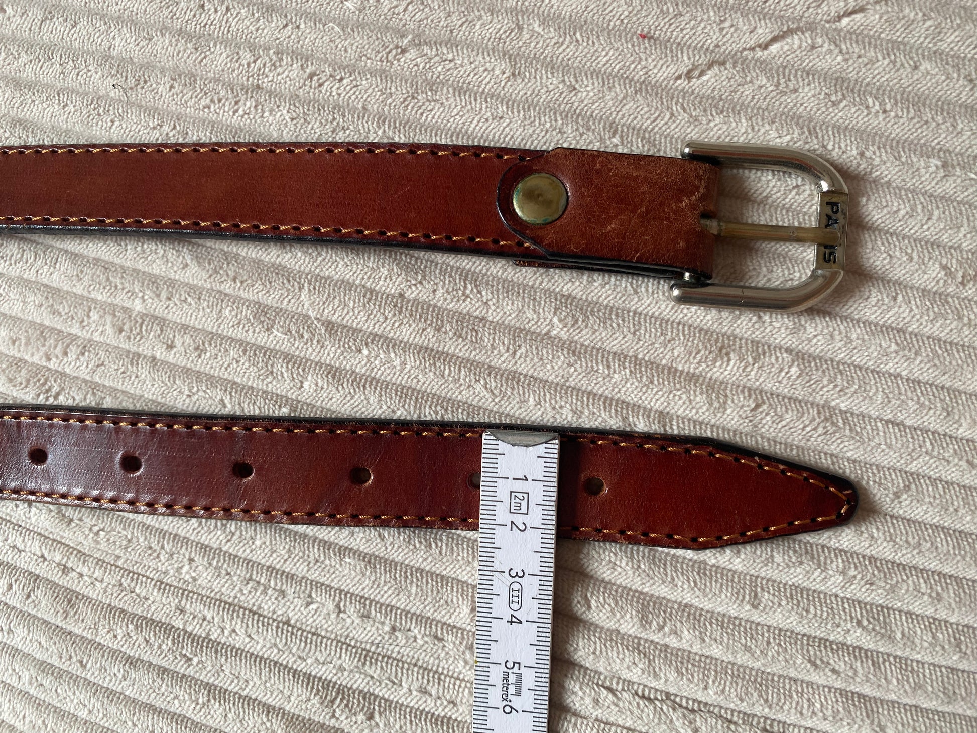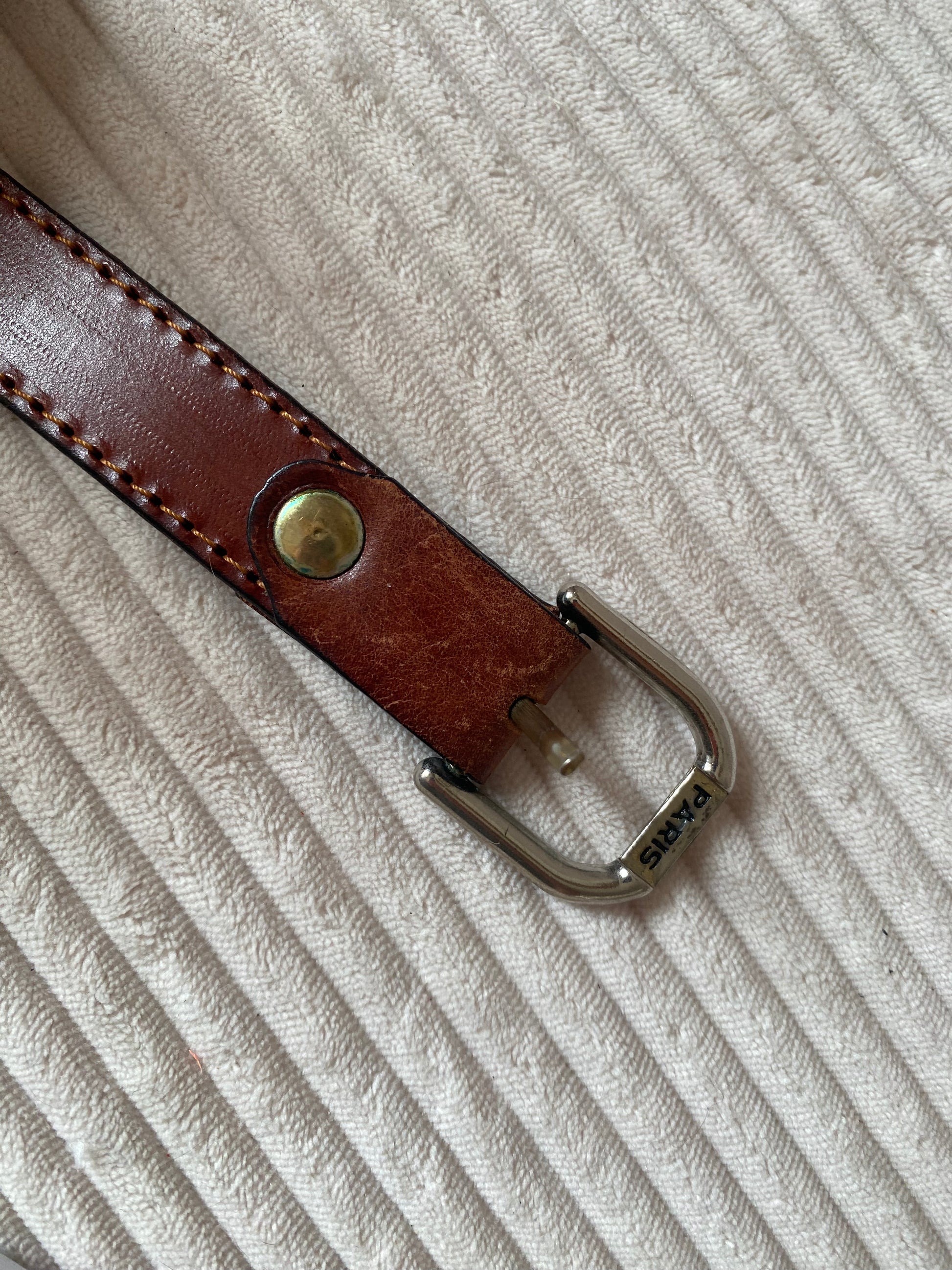 Glattes Leder mit Naht am Rand und silberner Metallschnalle mit der Prägung "PARIS". Viele Löcher, für viele Größen passend.