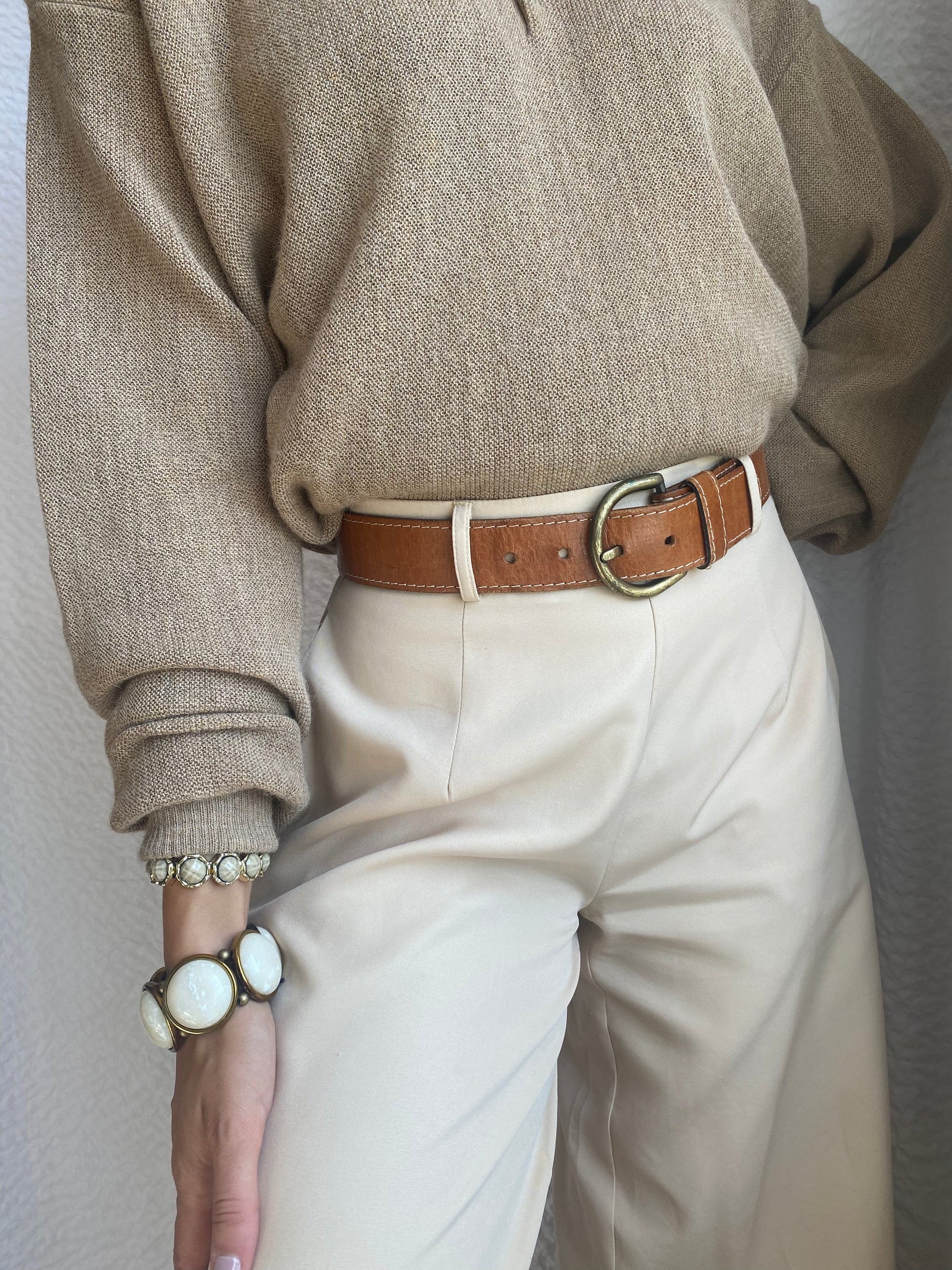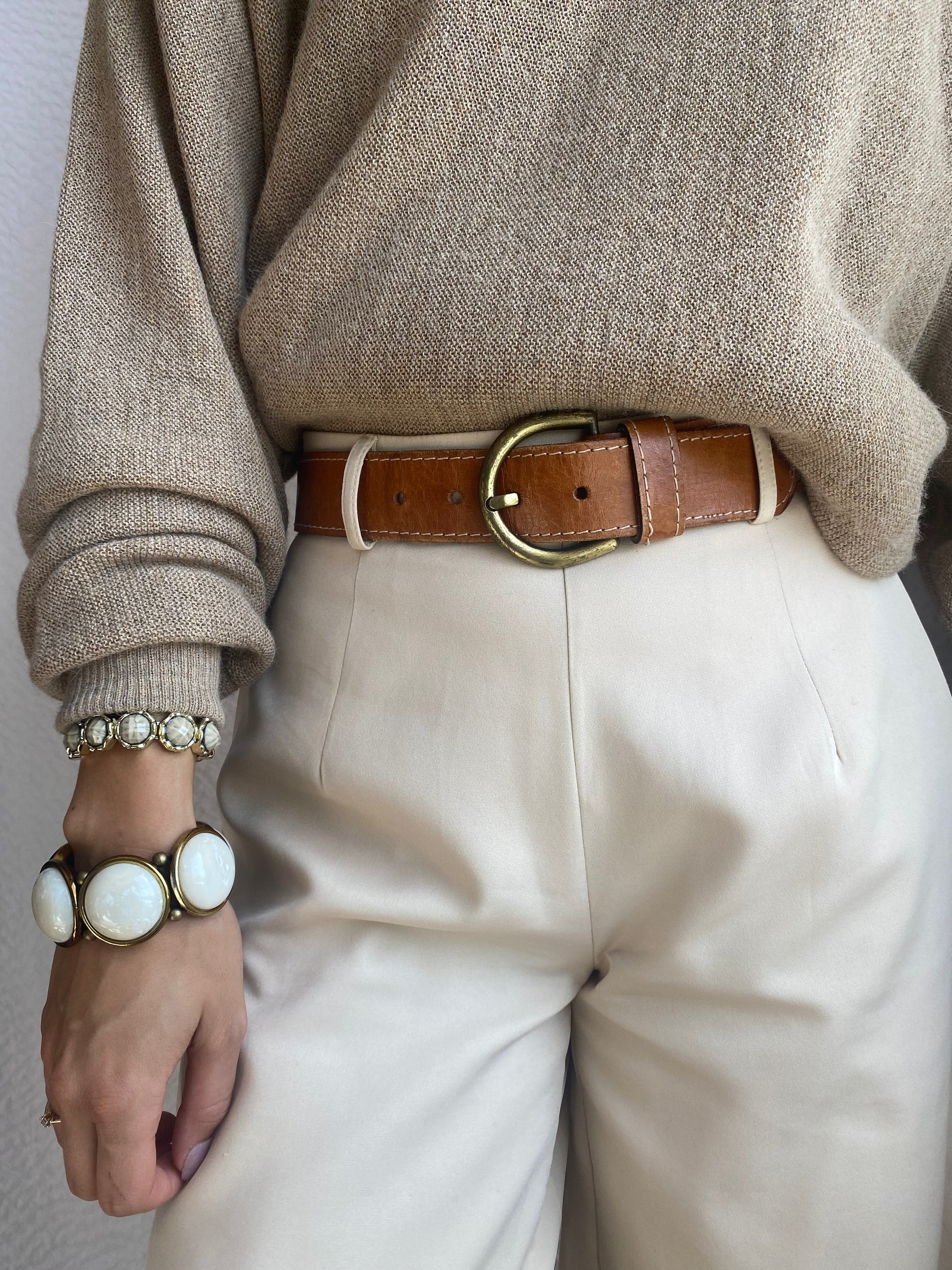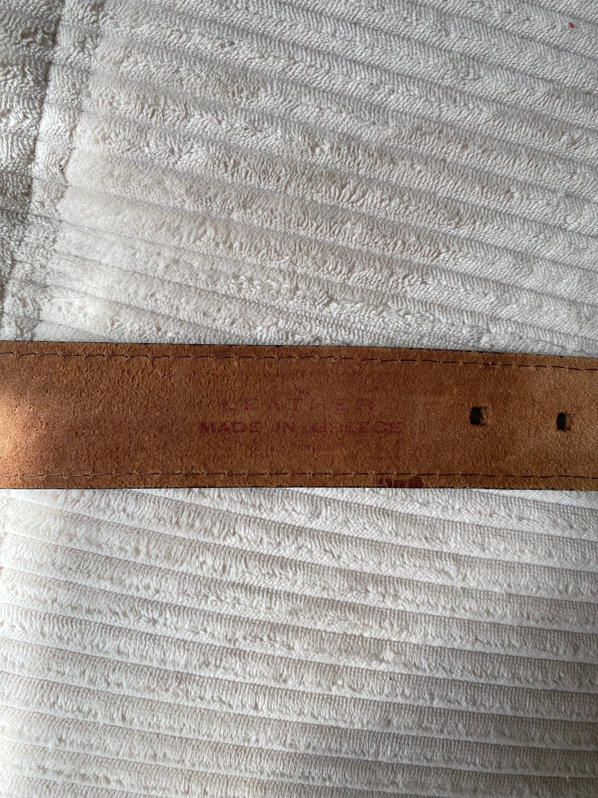 Wunderschöner edler Gürtel in cognac braun mit weiß-creme Naht abgesetzt. Goldfarbene Metallschnalle. Etwas breiter; robust. Elegantes Basic, passt schön zu weiten Jeans oder Stoffhosen. Made in Greece.
