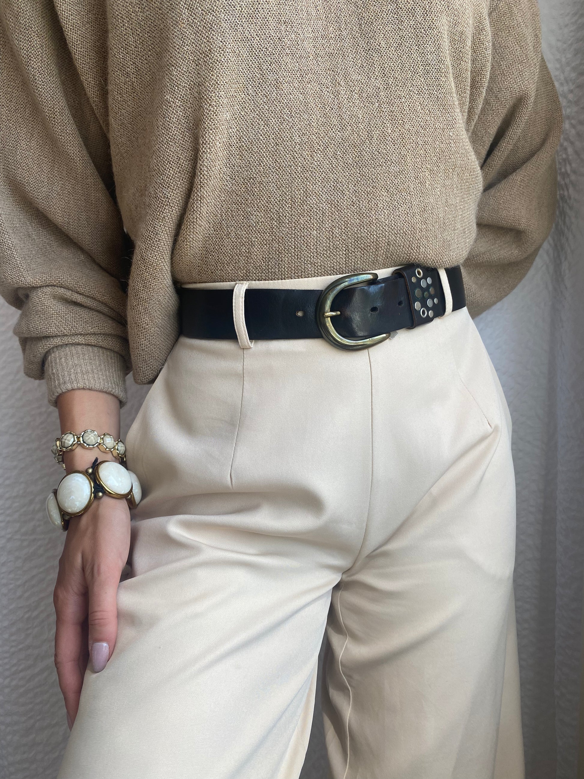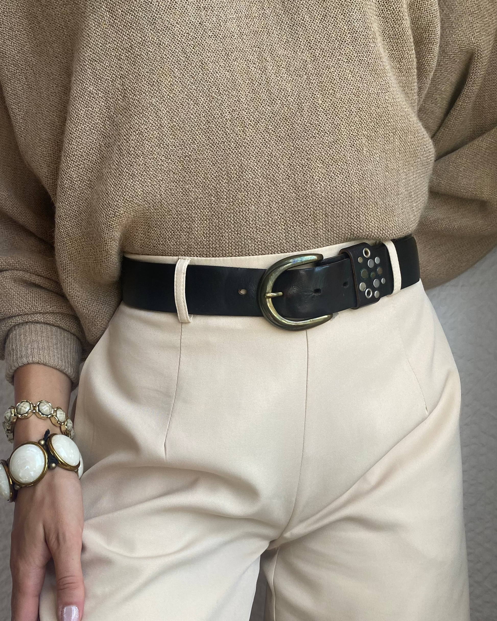 Glattes Leder mit Metallschnalle und Verzierung mit Nieten neben der Schnalle