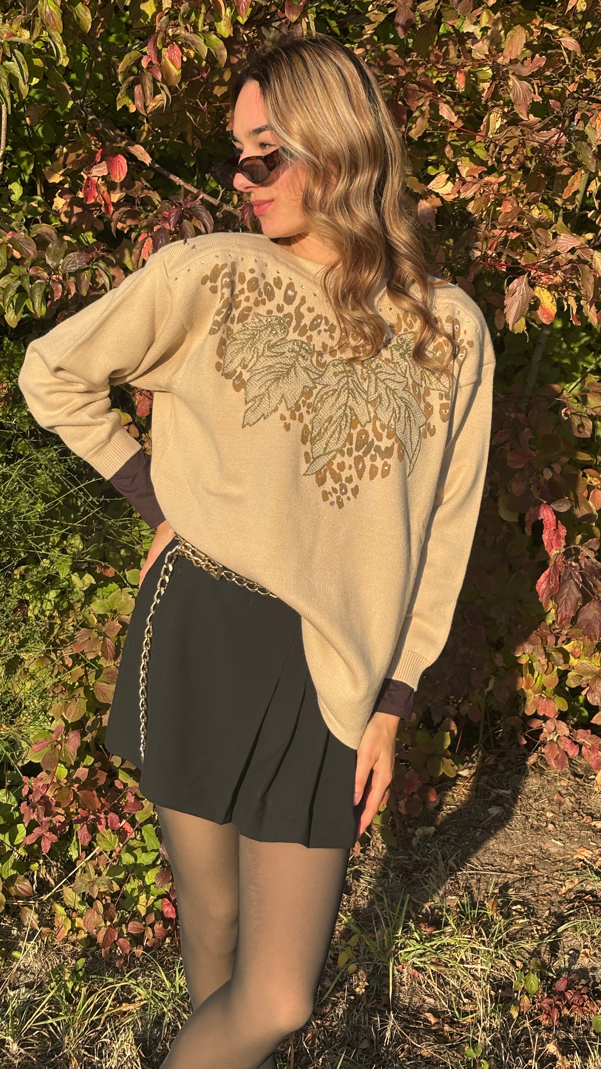 Print/Muster vorne, herbstlich mit goldenen Blättern bestickt und Strass Steine glitzernd silber