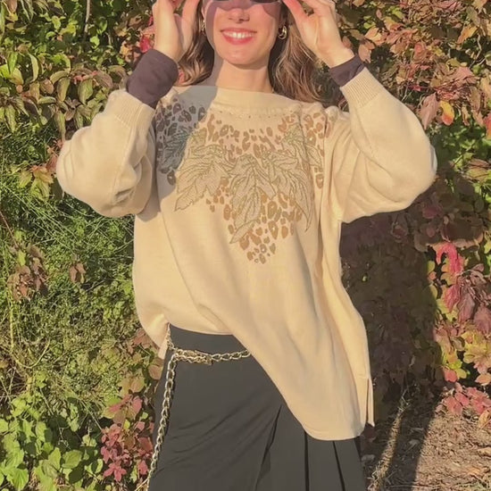 Da Capo Retro Merinowolle Sweater in beige, verziert, oversize S,M,L