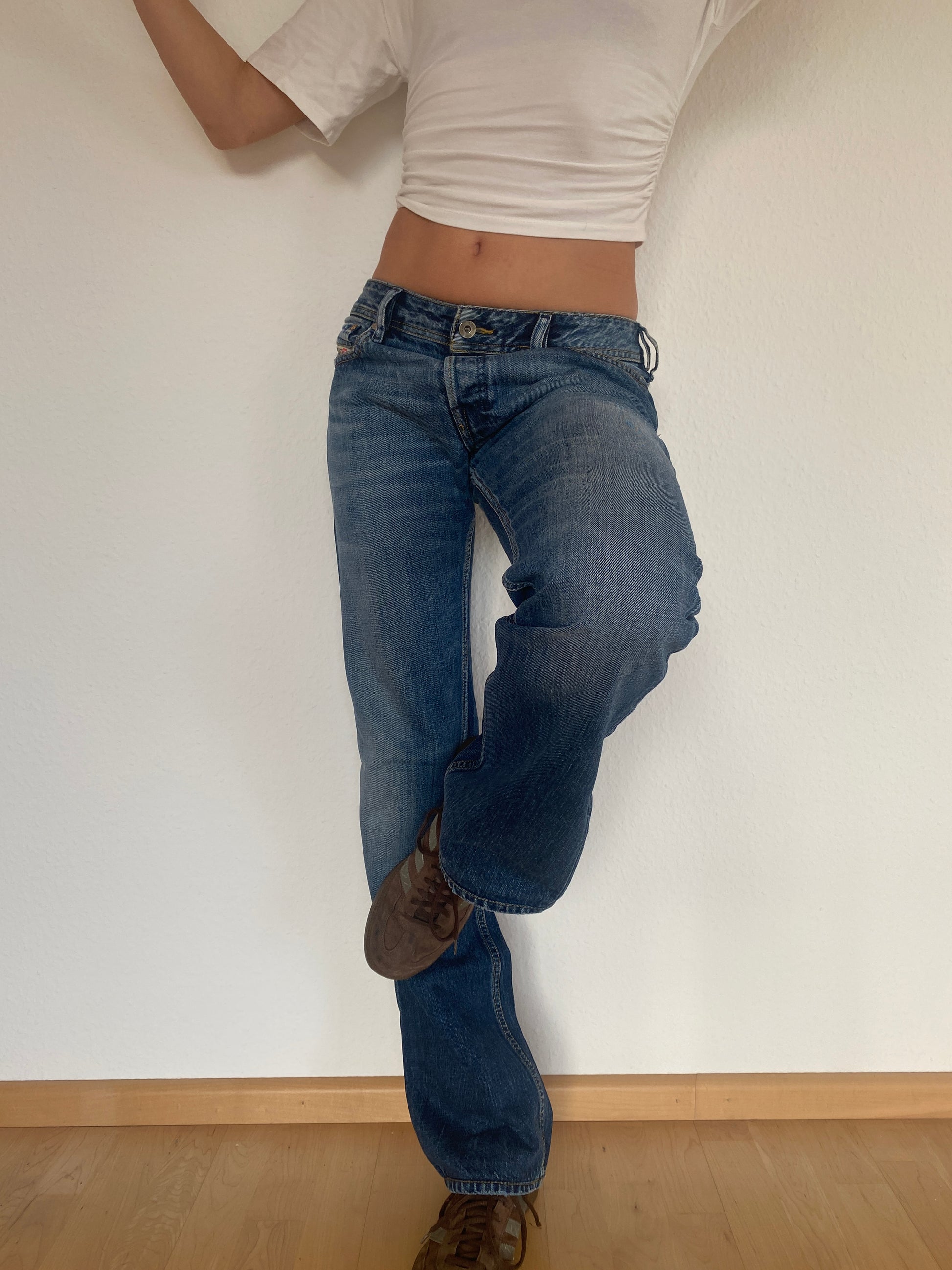 Straight gerade, Bootcut annährend; Low bis Mid Waist, ursprünglich ein Herren-Modell