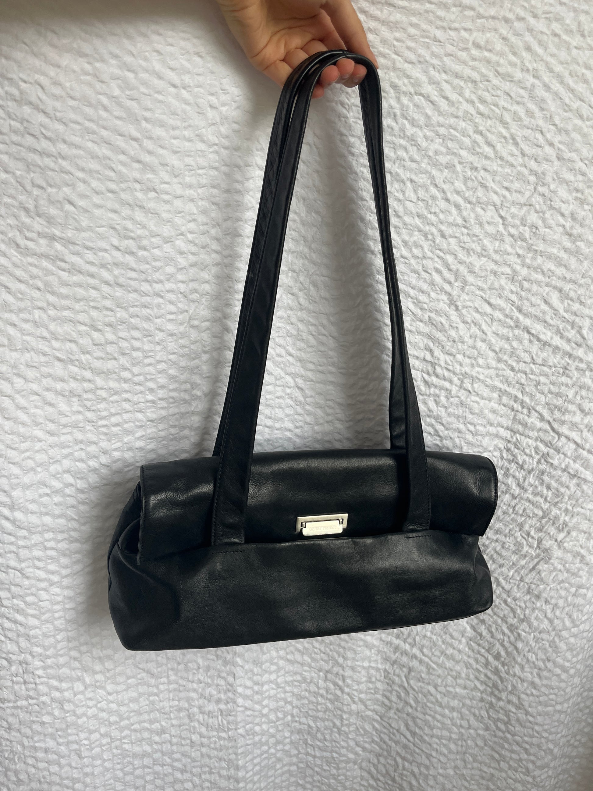Elegante Baguette Bag Stil längliche Echtleder Handtasche in schwarz. Silbernes Logo dient als Schnalle und Verschluss für die Tasche, zusätzlich ein Reißverschluss-Fach außen vorne und hinten. Sehr weiches, angenehmes Material. Trageriemen Henkel für die Schulter.