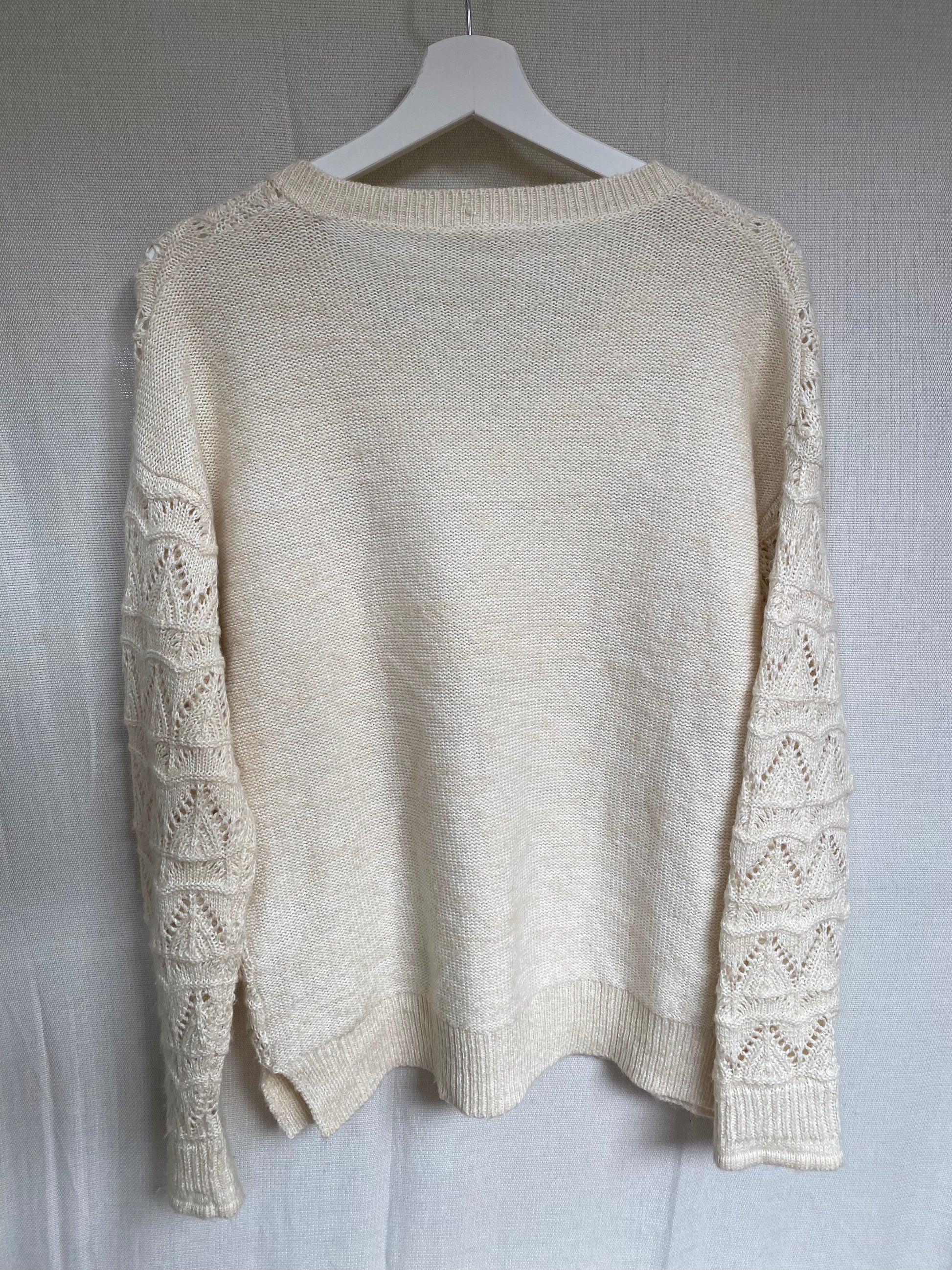 Hübscher Pullover in toller Creme Farbe hellbraun beige sand mit V-Ausschnitt und vorne Strickmuster Lochmuster Grobstrick Häkel-Stil