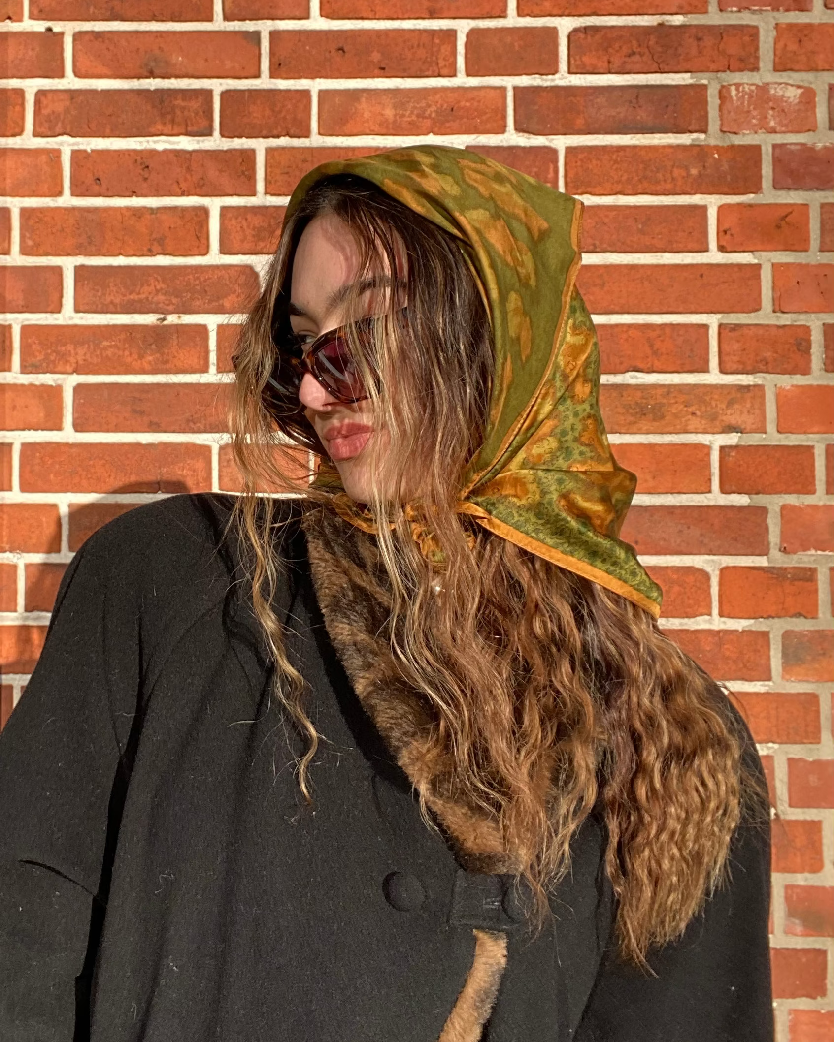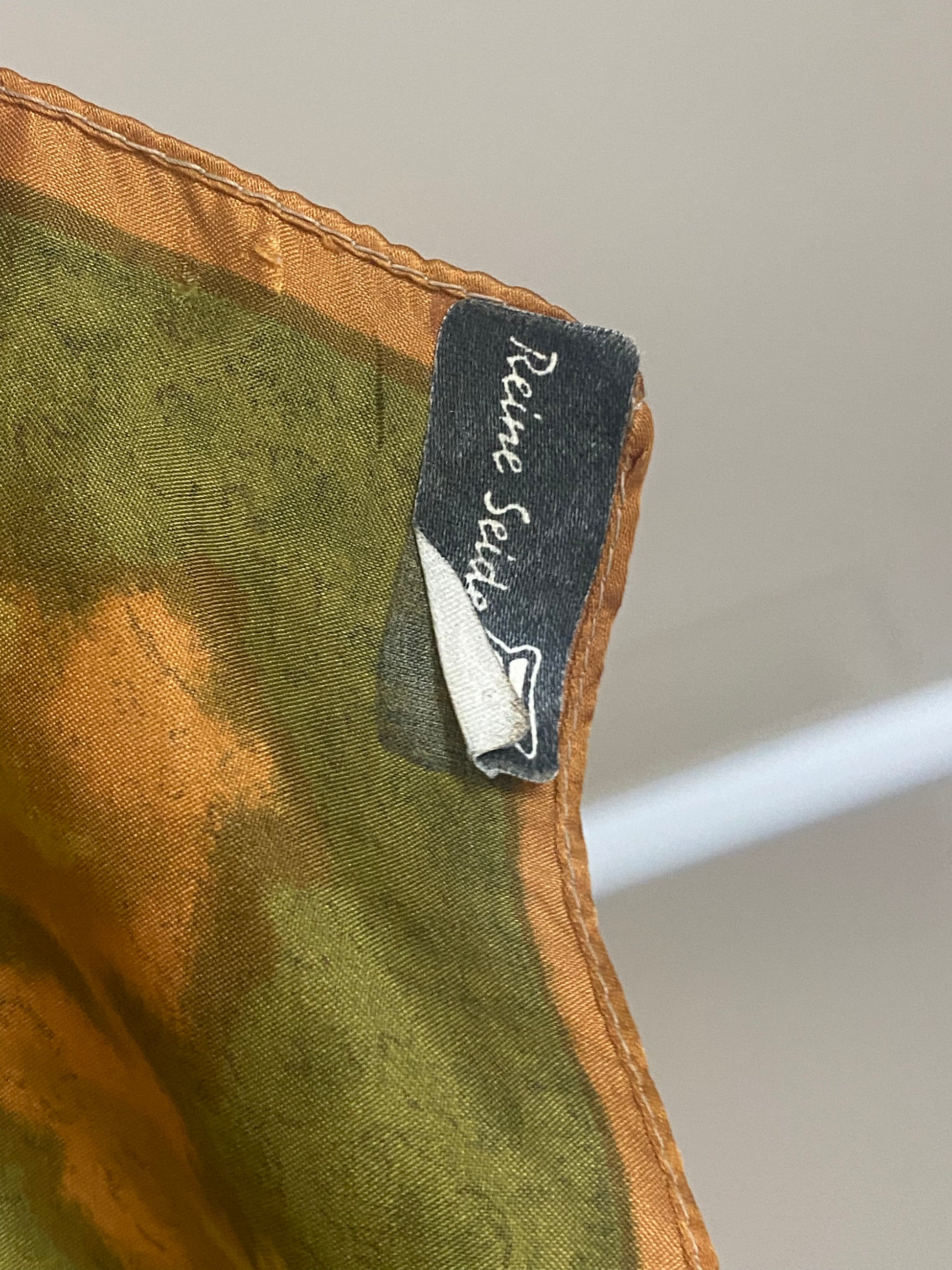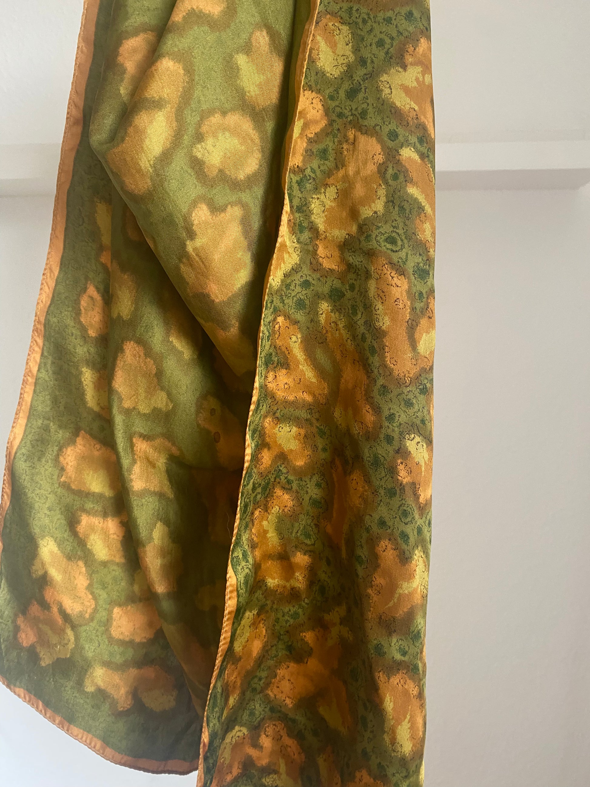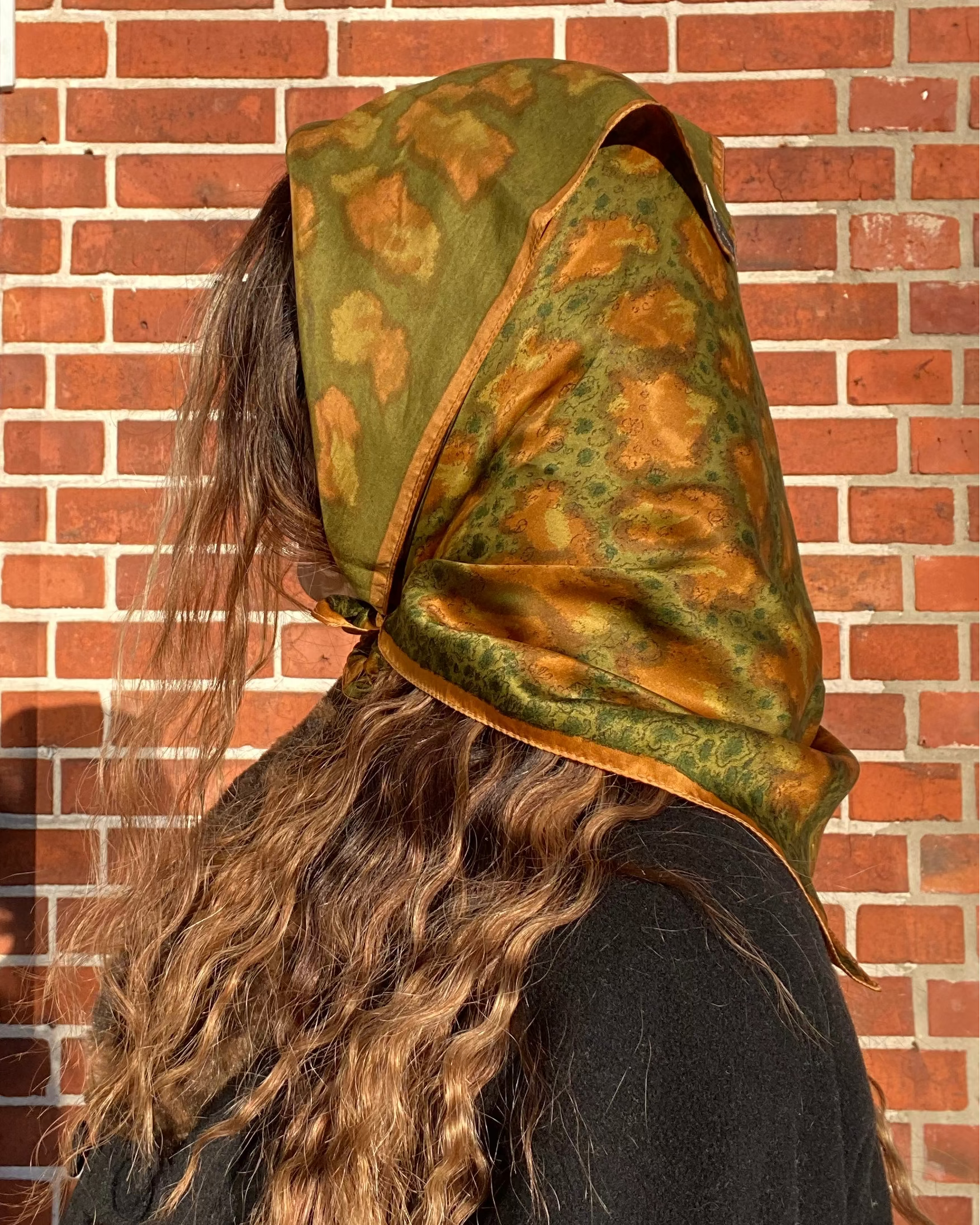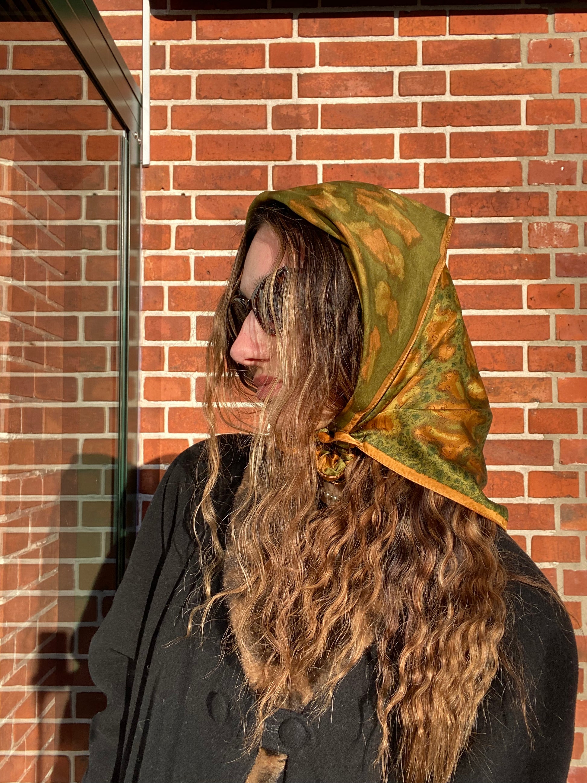 Weiches, elegantes Quadrattuch aus Seide. Halstuch oder Dreieckstuch geknotet am Kopf