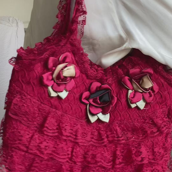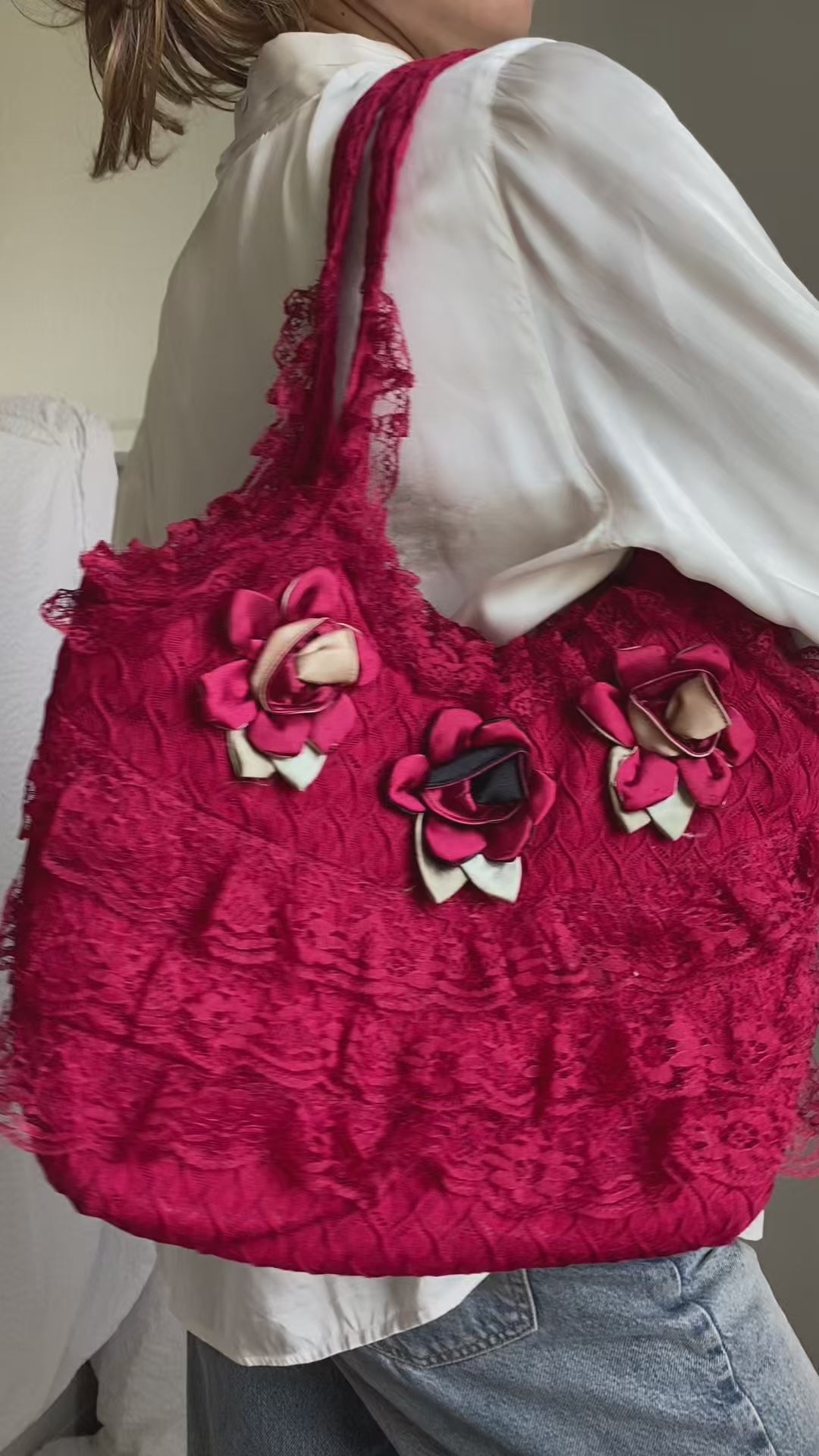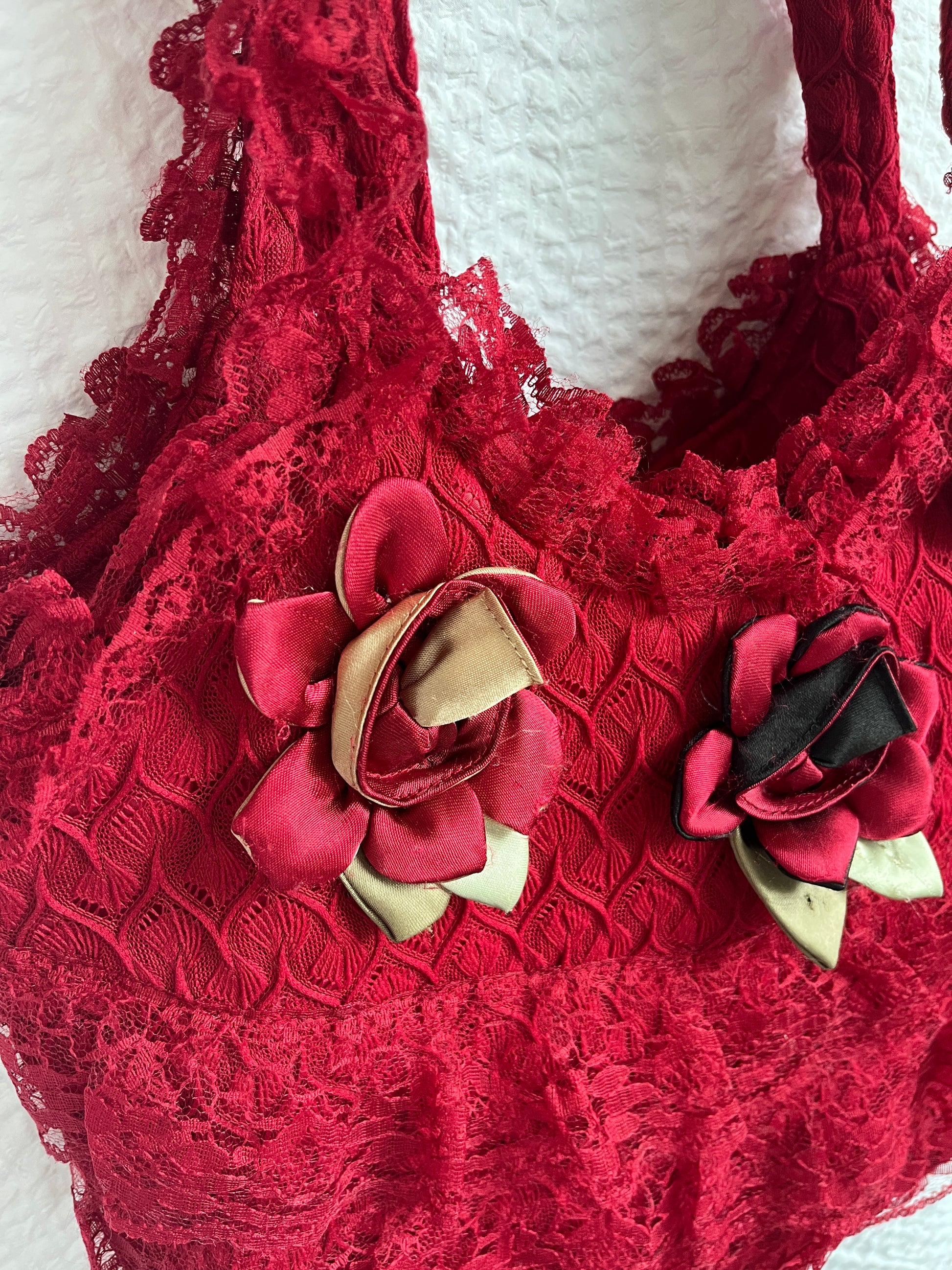 Handtasche aus rotem Stoff mit Spitze und Rosen-Verzierung