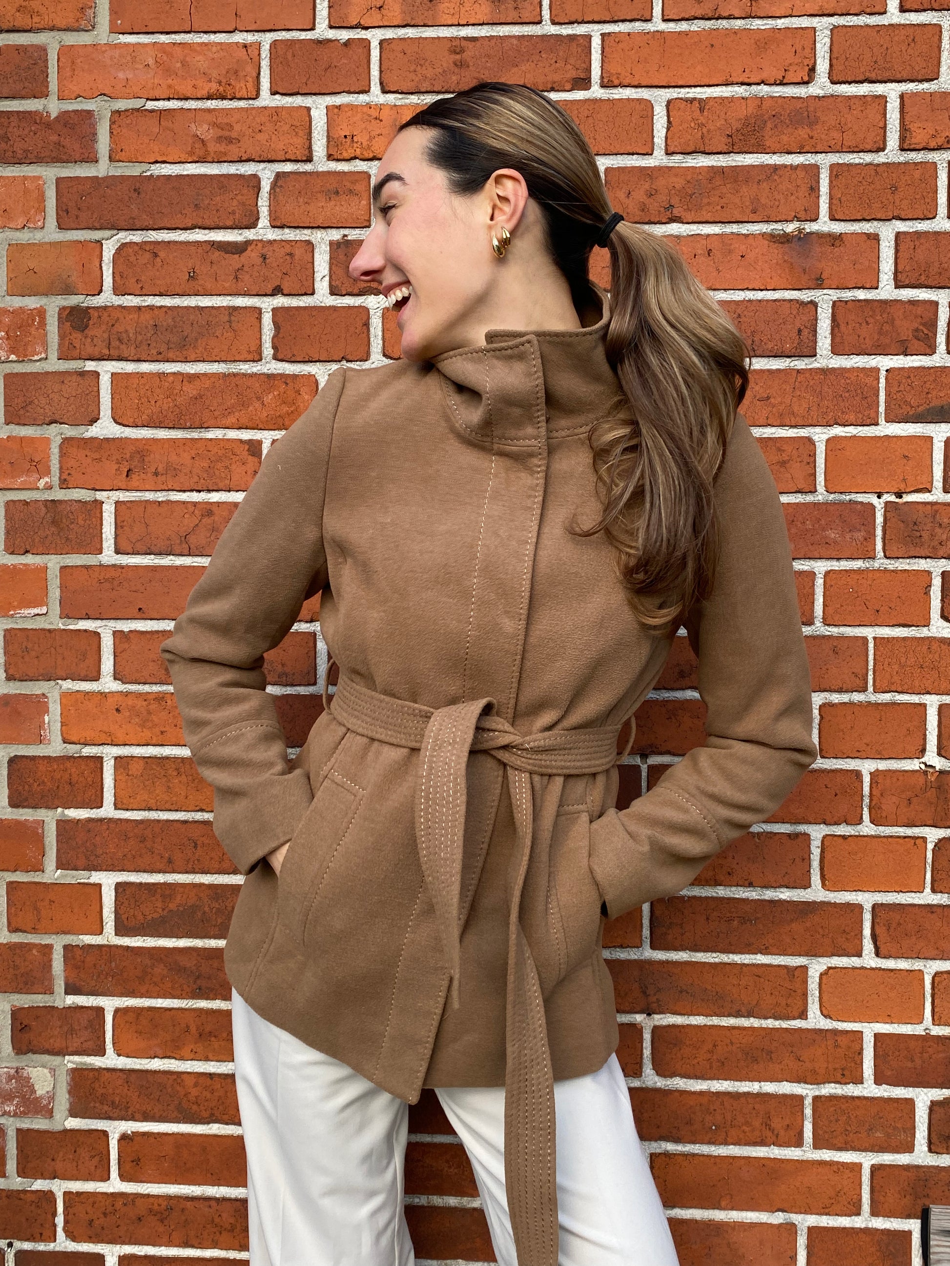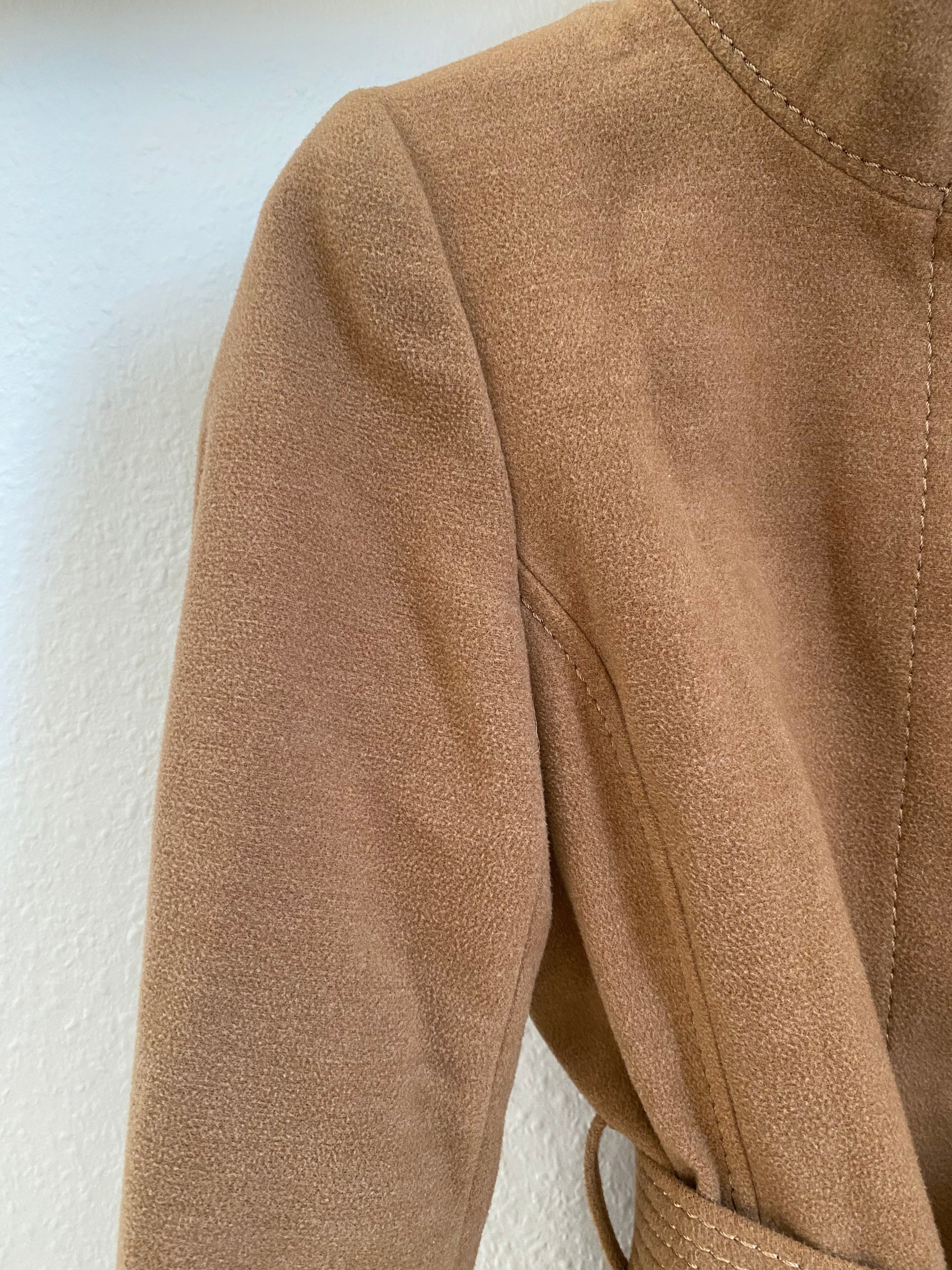 Elegante Jacke Kurzmantel in hellem braun / kamel / caramel farben. Verdeckte Knopfleiste, hoher Kragen. Mit Bindegürtel an der Taille