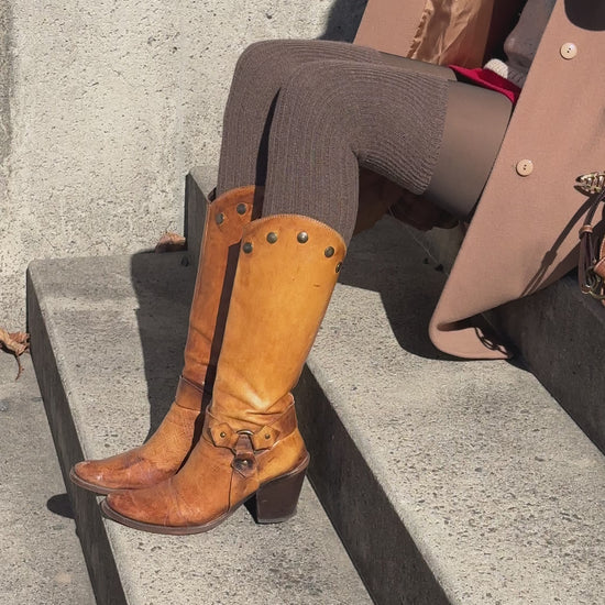 Elegante Stiefel mit Absatz, halbhoch, Wadebedeckend. Warmes hellbraun cognac rost mit Struktur Patina Färbung; Zierdetails oben Nieten und unten optisch Schnalle Riemen mit Metallring. Schöne Farbschattierungen auf glattem Leder.