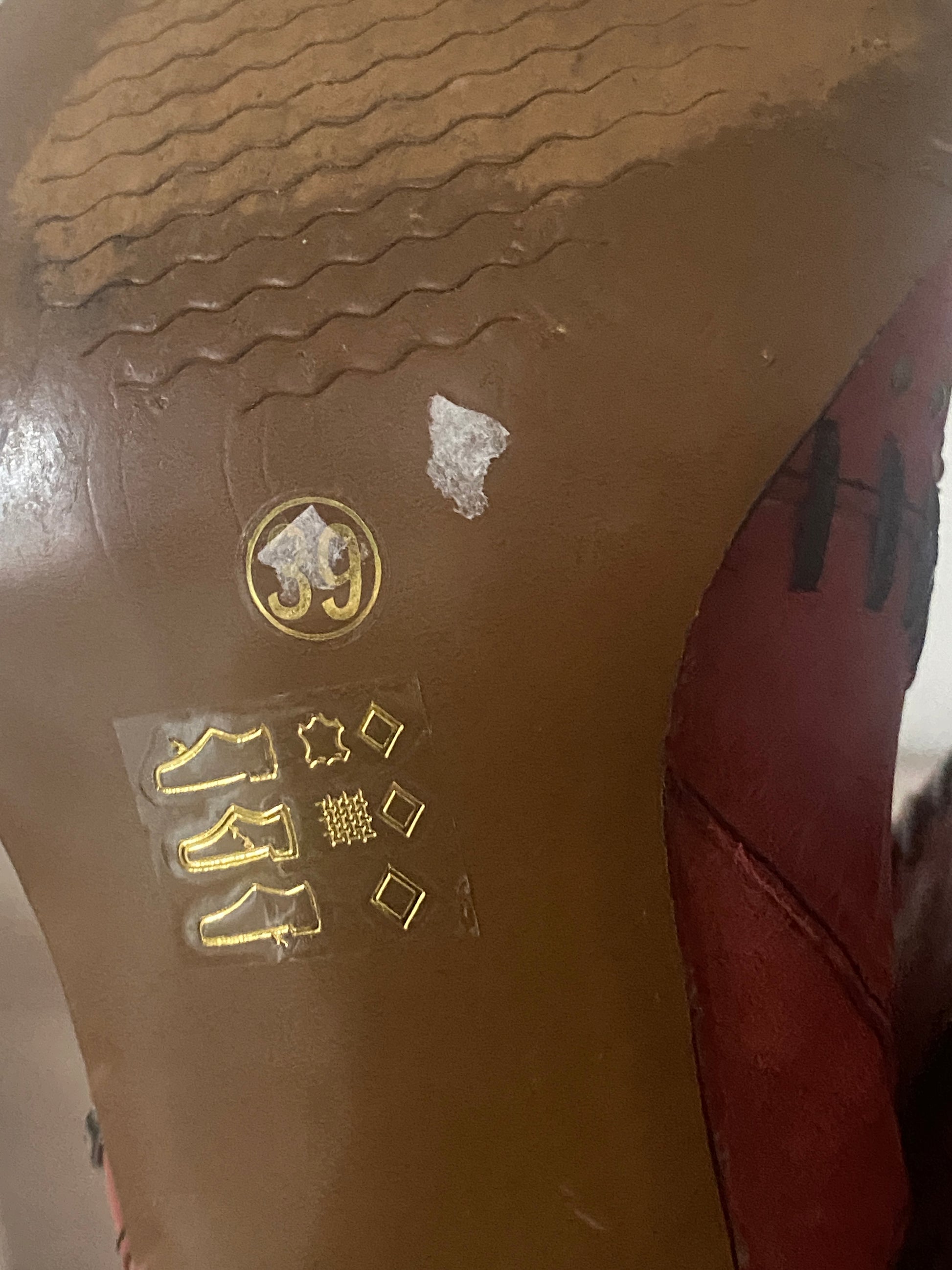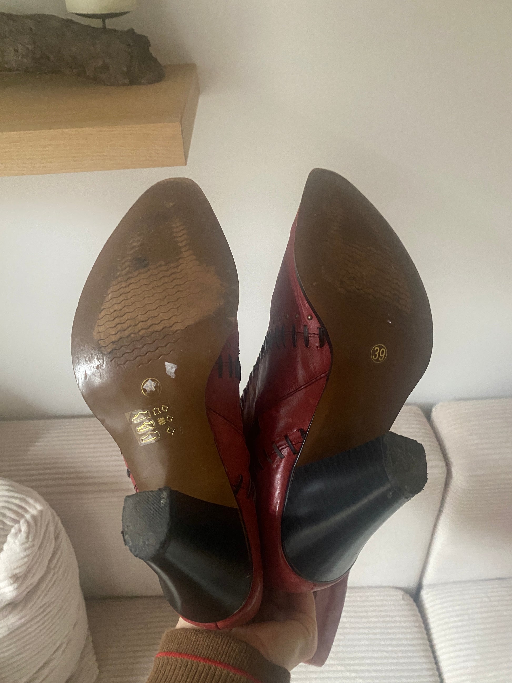 Lederstiefel in bordeaux rot mit schwarzer Verzierung und Absatz, Gr. 39