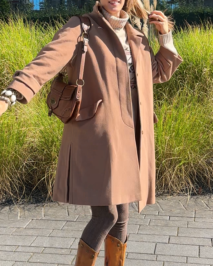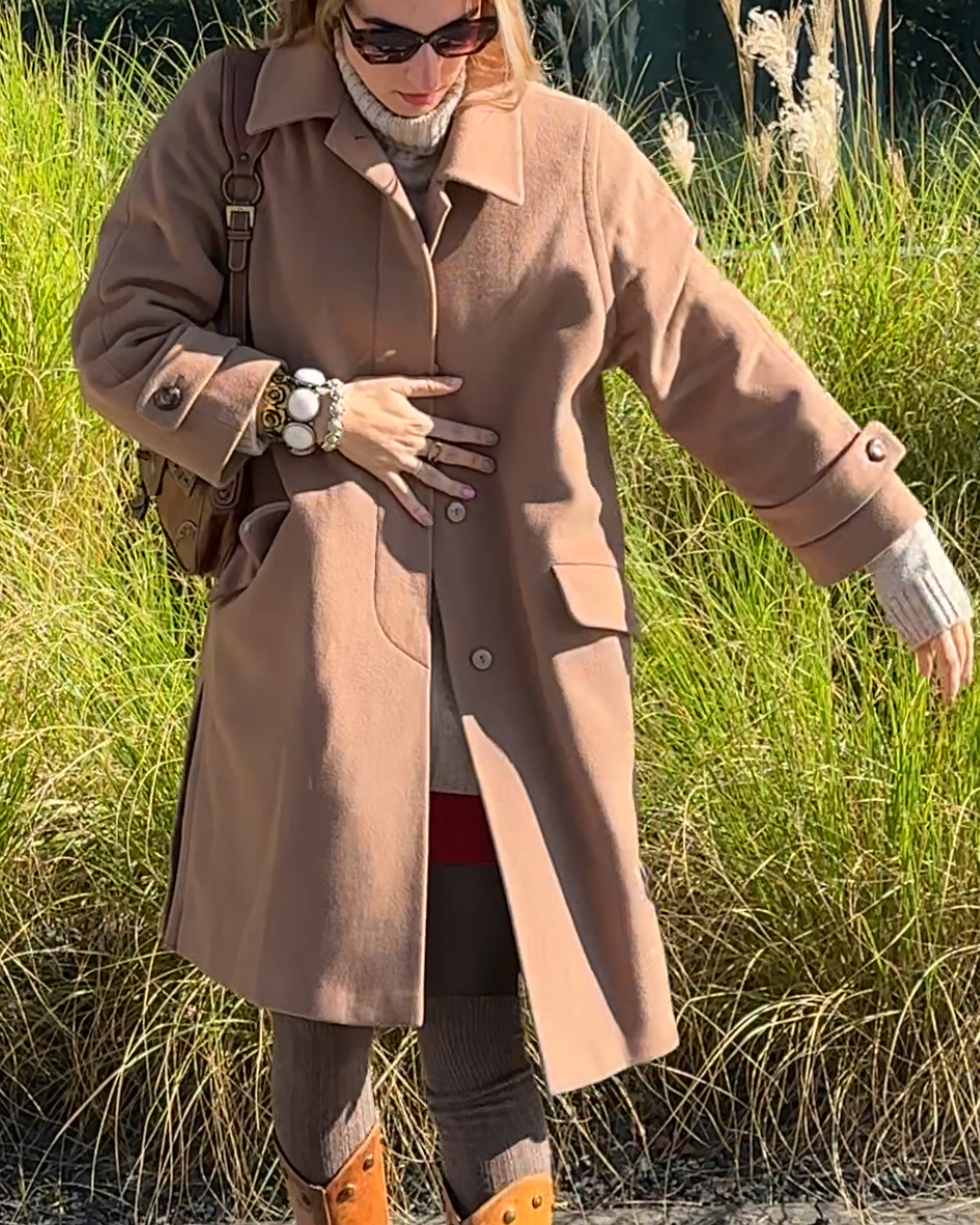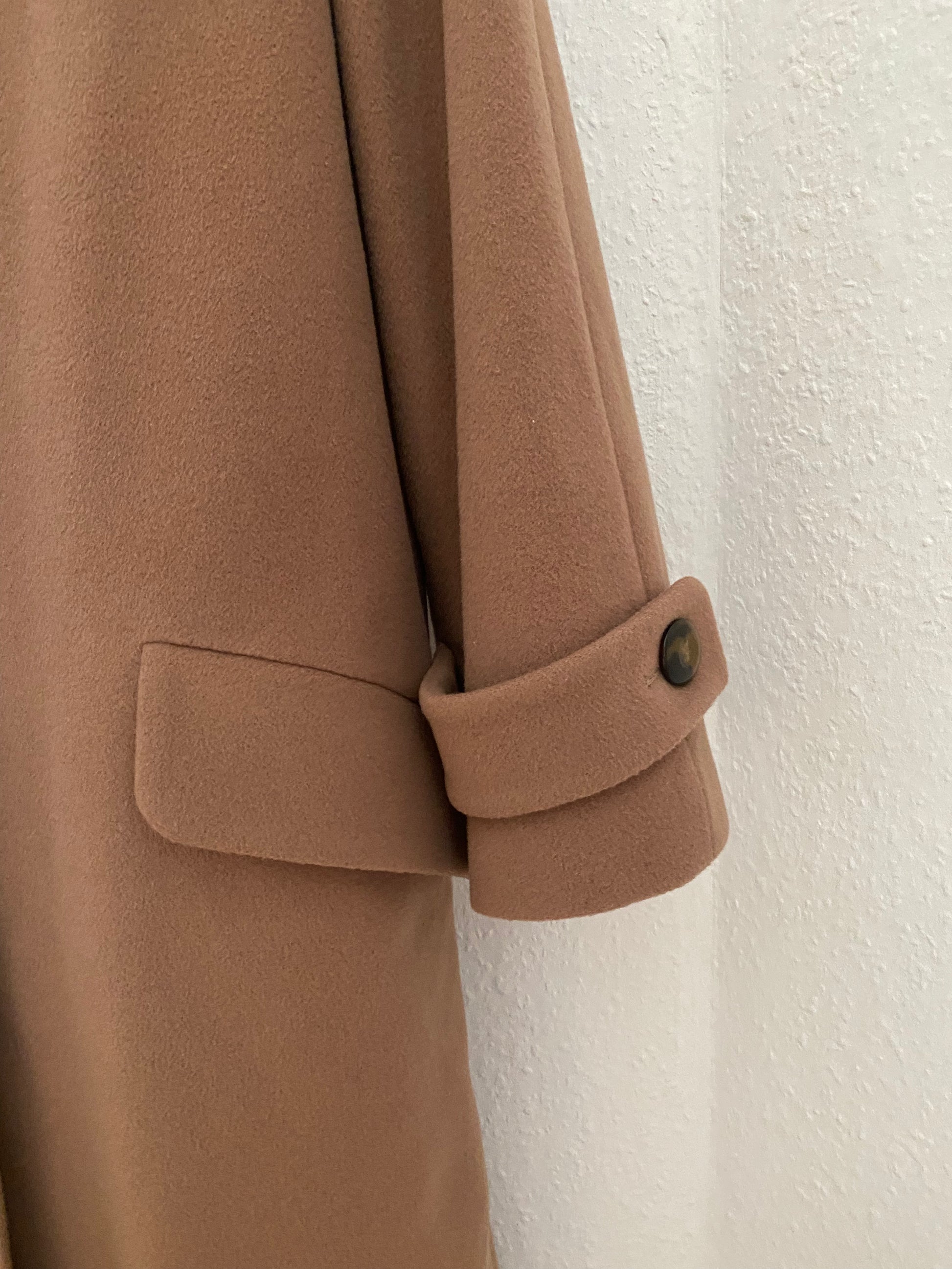 Erdige Farbe, hell braun kamel karamell beige farben; eleganter schicker Mantel bis zu den Knien. Hochwertiges Oberstoff-Material aus Kaschmir und Wolle.