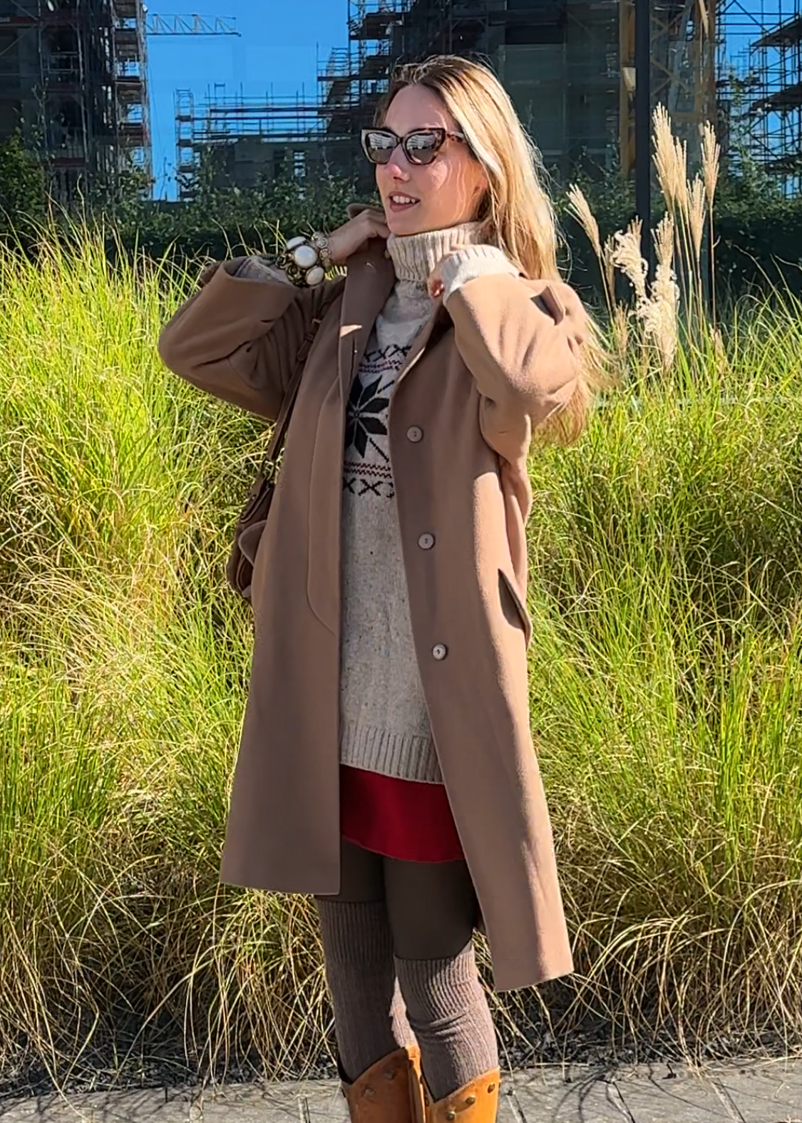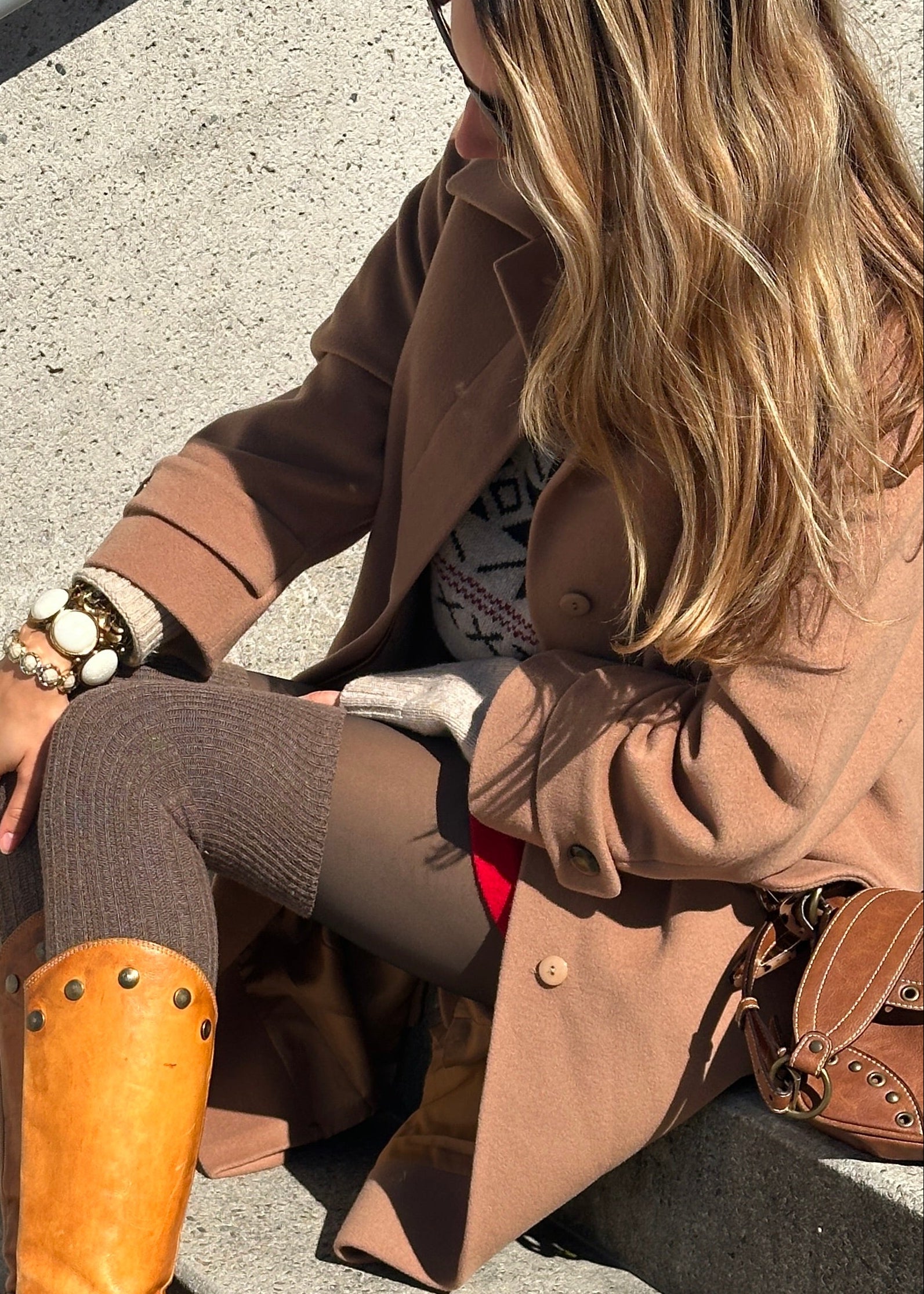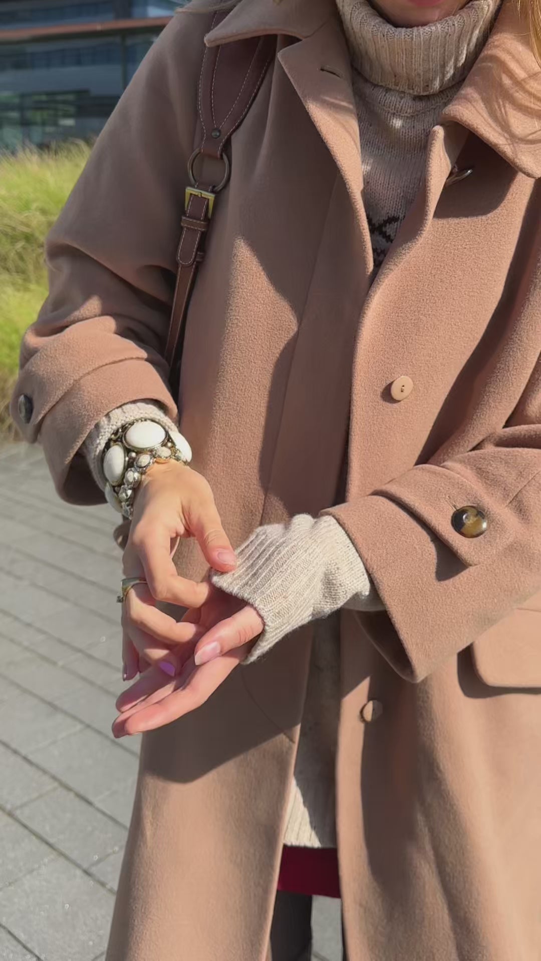 Erdige Farbe, hell braun kamel karamell beige farben; eleganter schicker Mantel bis zu den Knien. Hochwertiges Oberstoff-Material aus Kaschmir und Wolle.