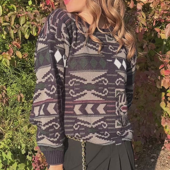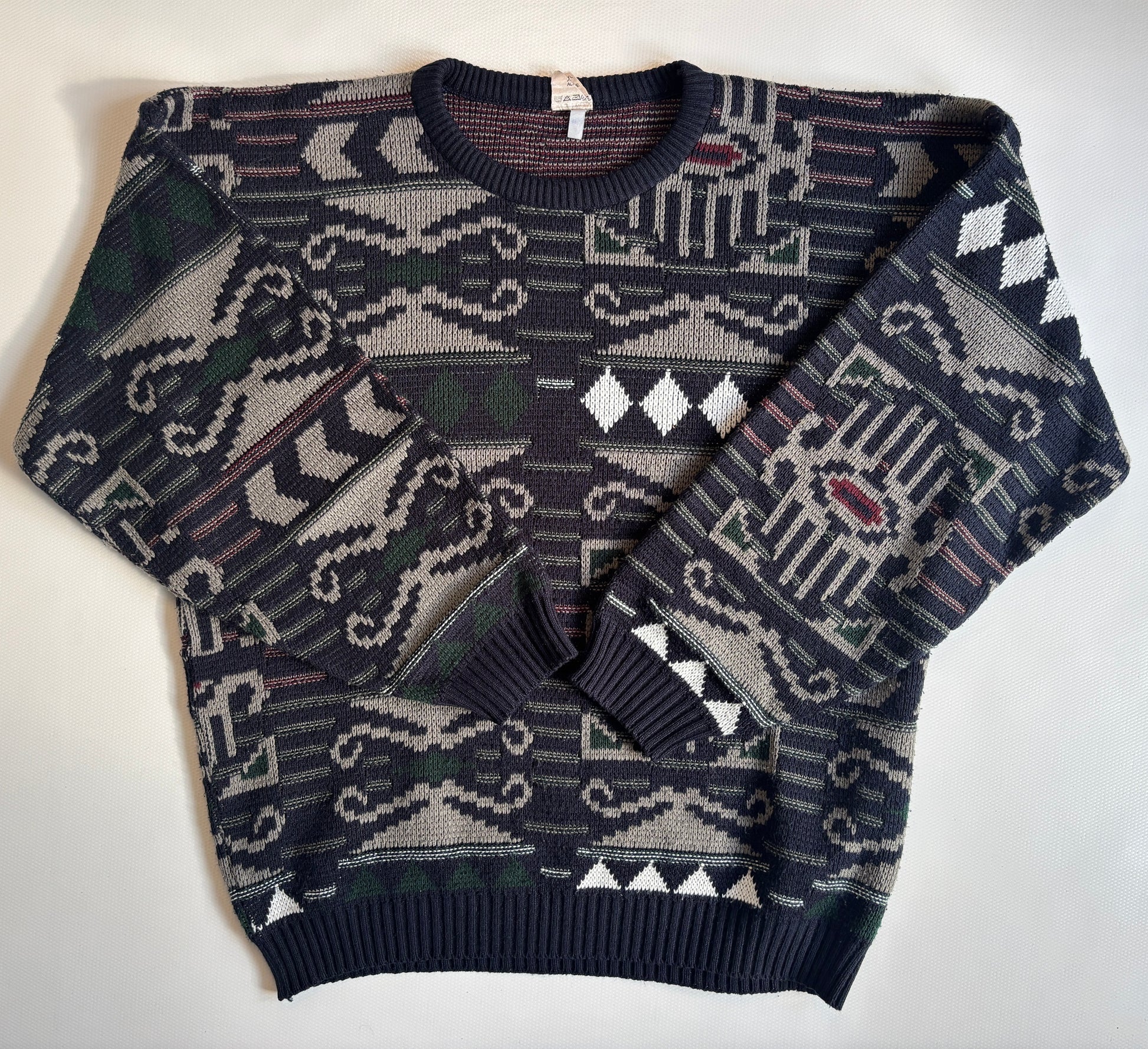 Rustikaler, geometrisch gemusterter Strickpullover in marine dunkelblau mit weiĂź grĂĽn weinrot Akzenten im Muster.
