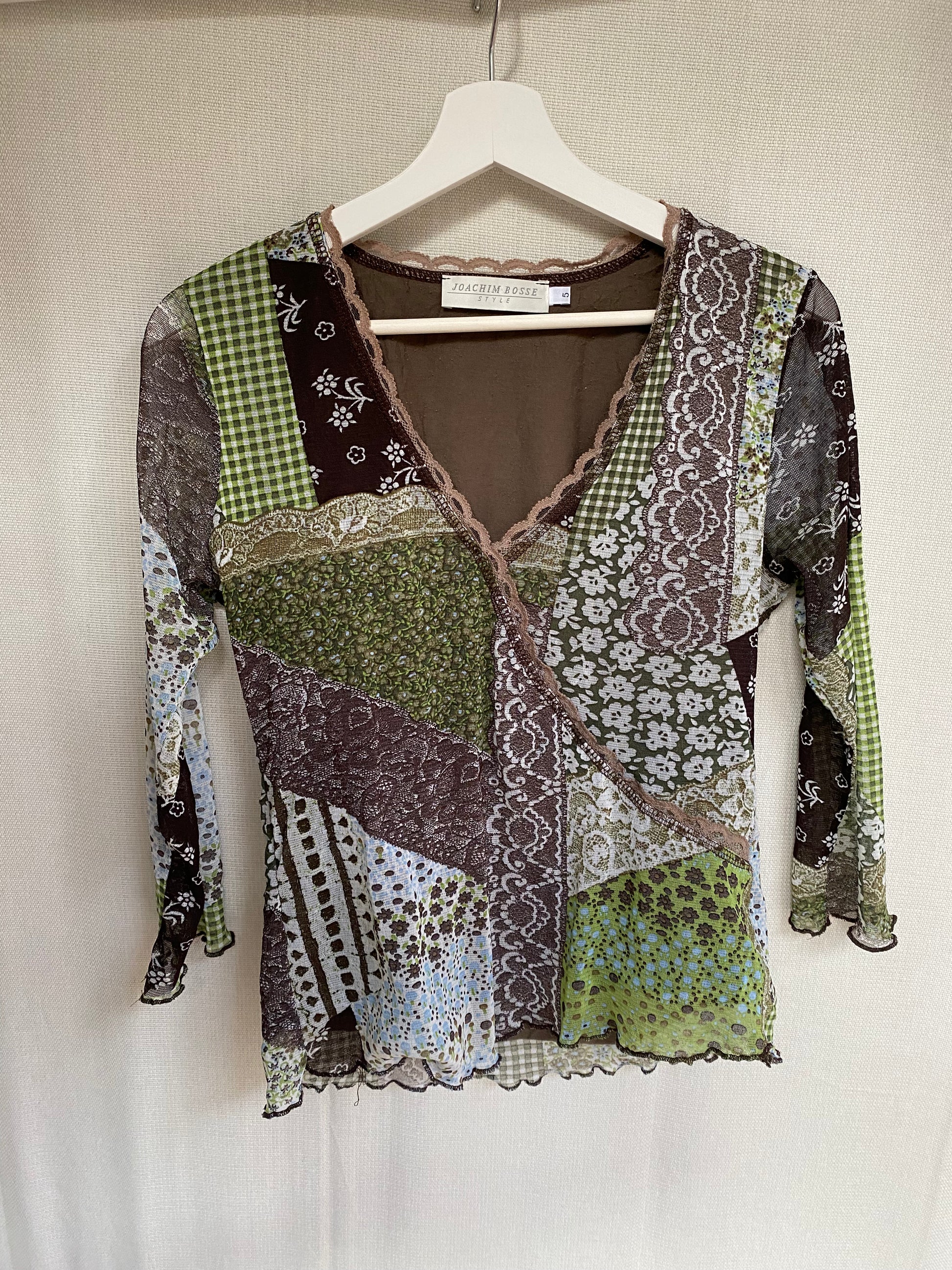 3/4 Arm Shirt mit Spitzenbordüre im Wickelstil Look mit tollem Muster Mix im Patchwork Stil