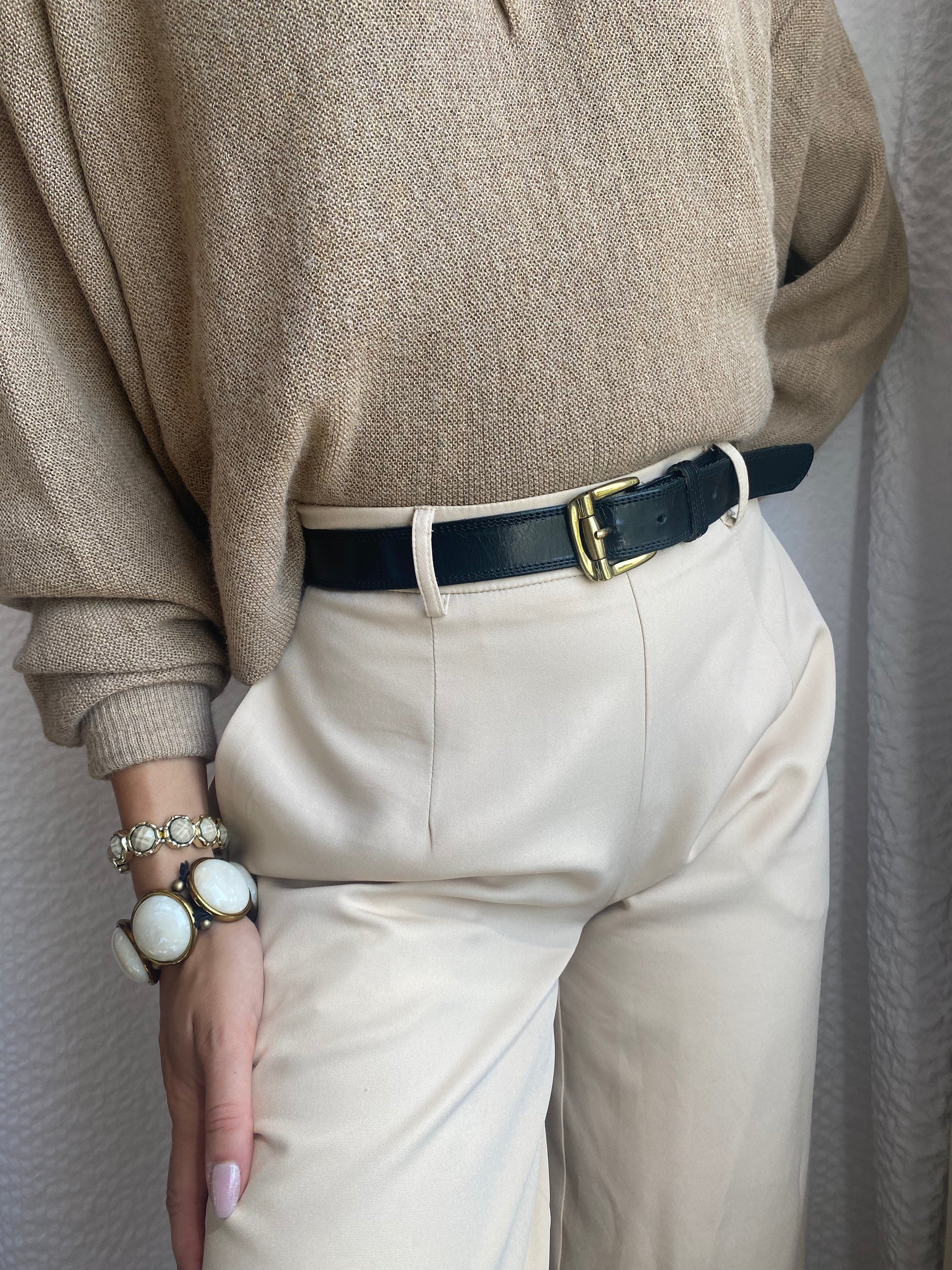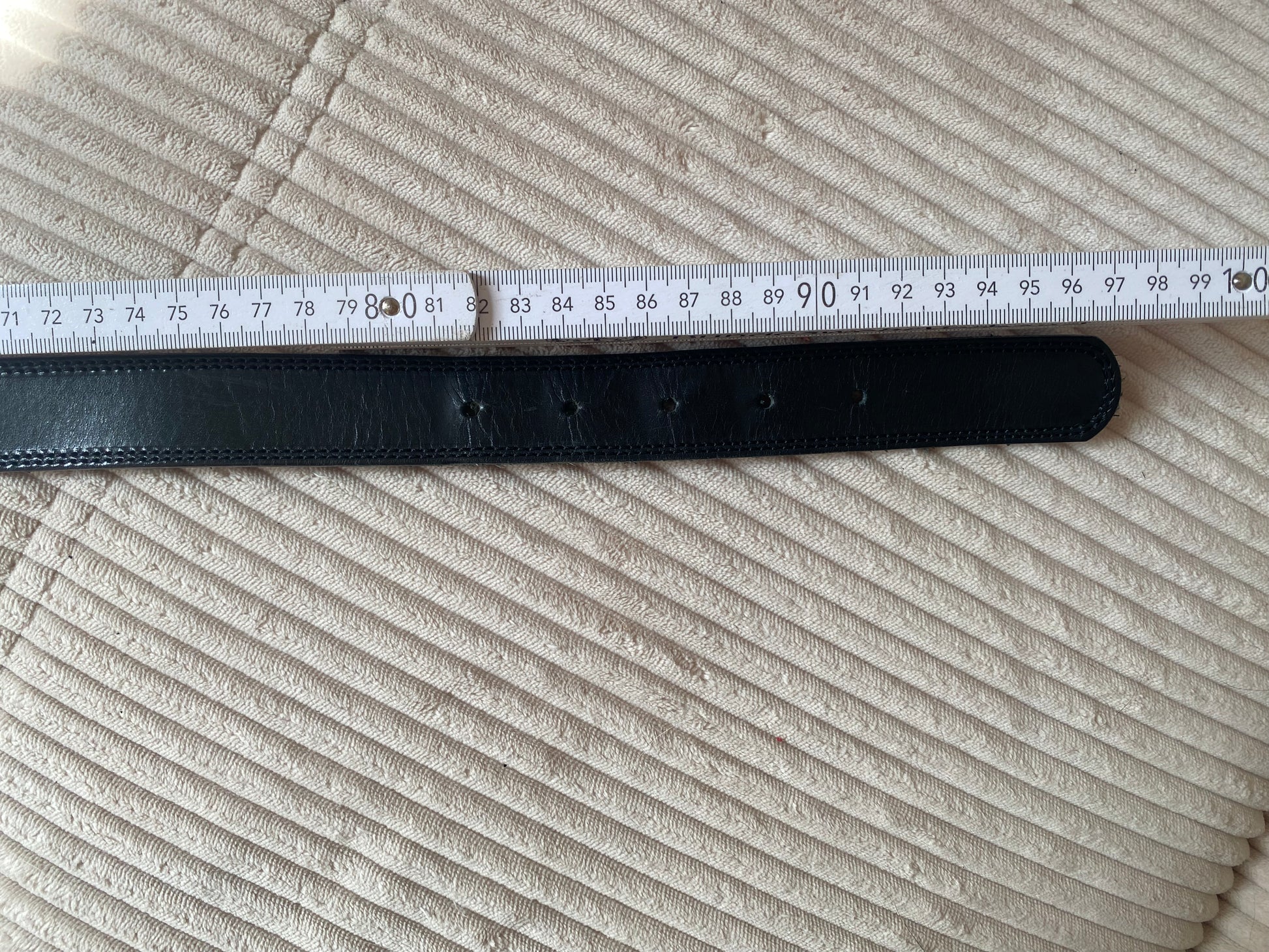 Hochwertiger Vollrindleder Gürtel, leicht glänzend, glattes Leder mit goldener Metallschnalle, die etwas breiter ist. Hingucker aber schlicht; schönes Basic-Piece, das das Outfit aufwertet. Passt zu Business-Outfits sowie zu lockeren Jeanshosen.