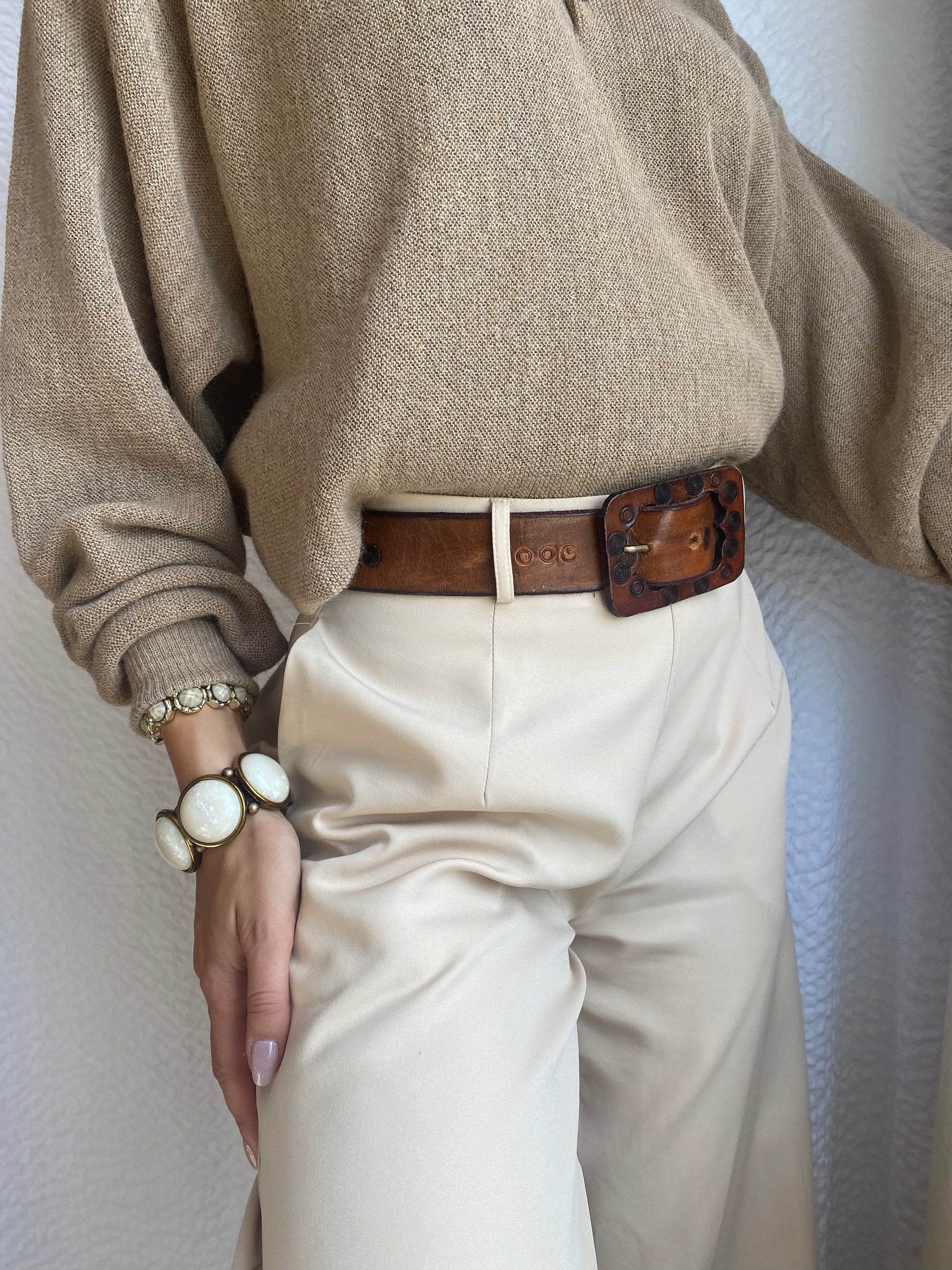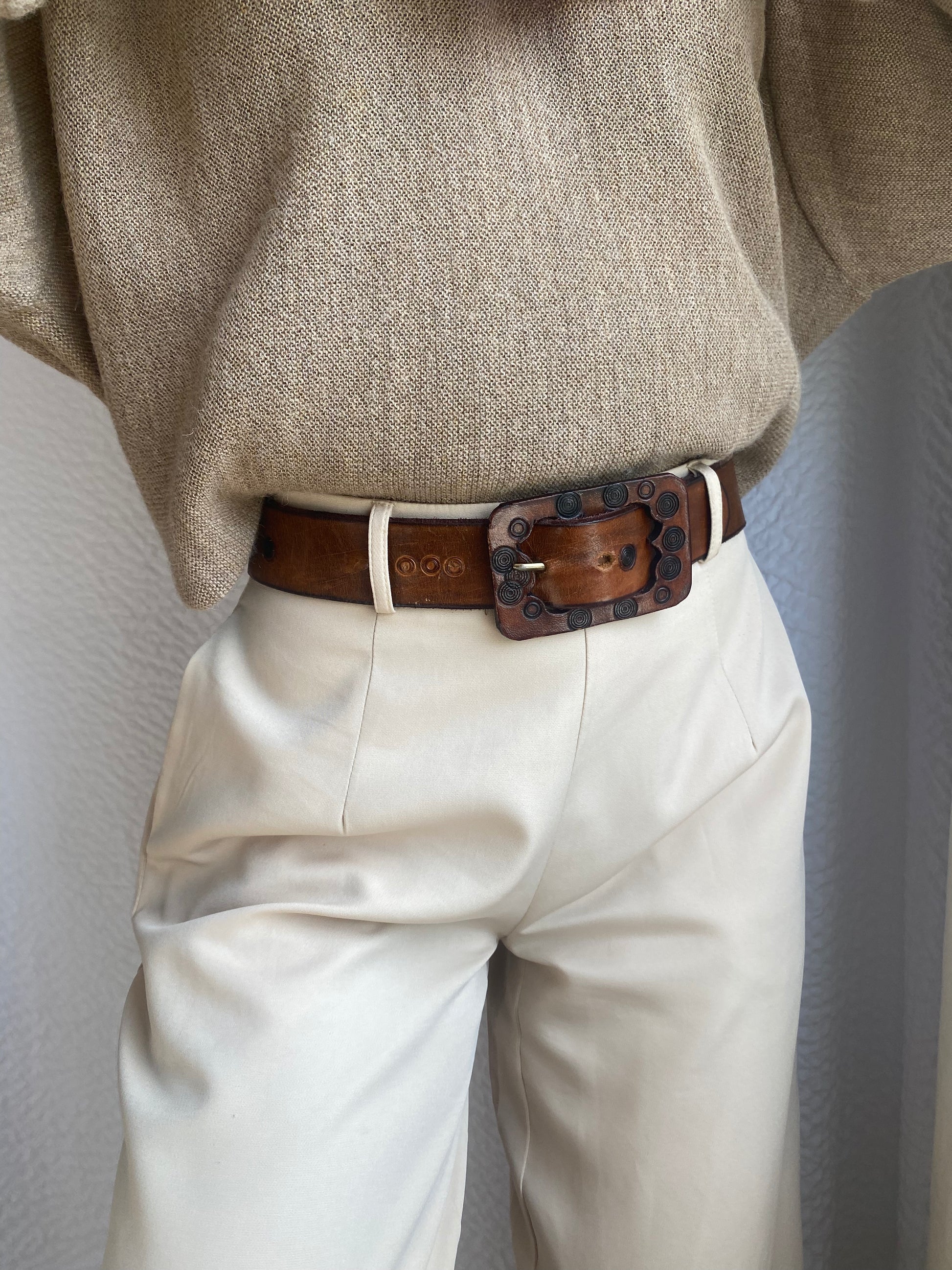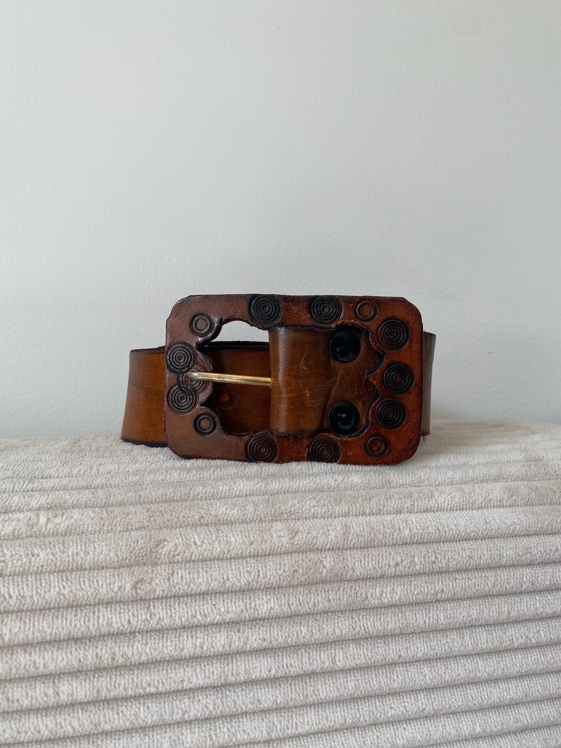 Breiter Gürtel mit Zierschnalle und handwerklich "eingebrannten" Kreis-Details. Schöne Patina – glattes Material. Warmes Braun mit Farbtiefe.