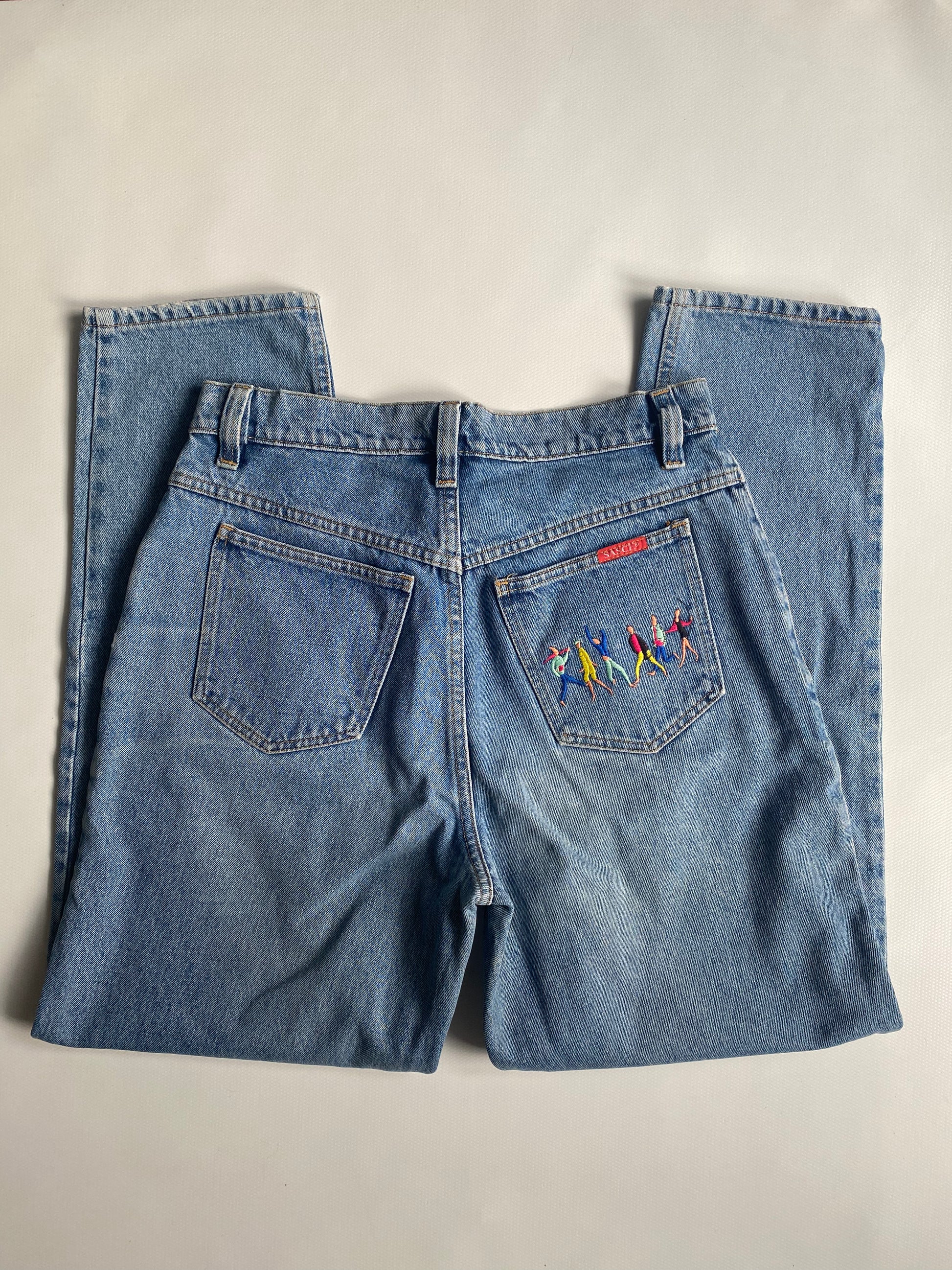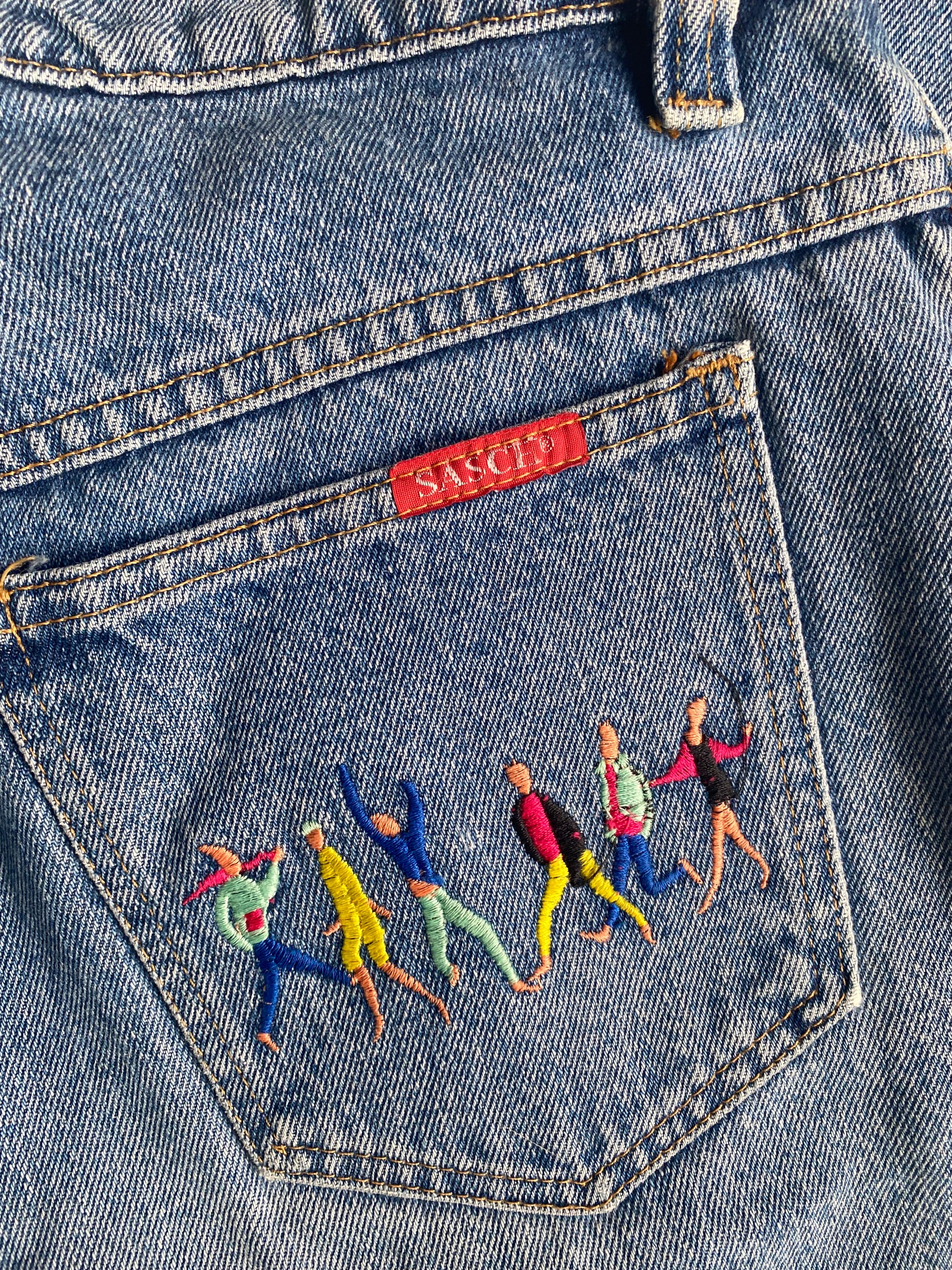 Vintage Sasch Retro Jeans in denim blau mit Stickerei Verzierung, M