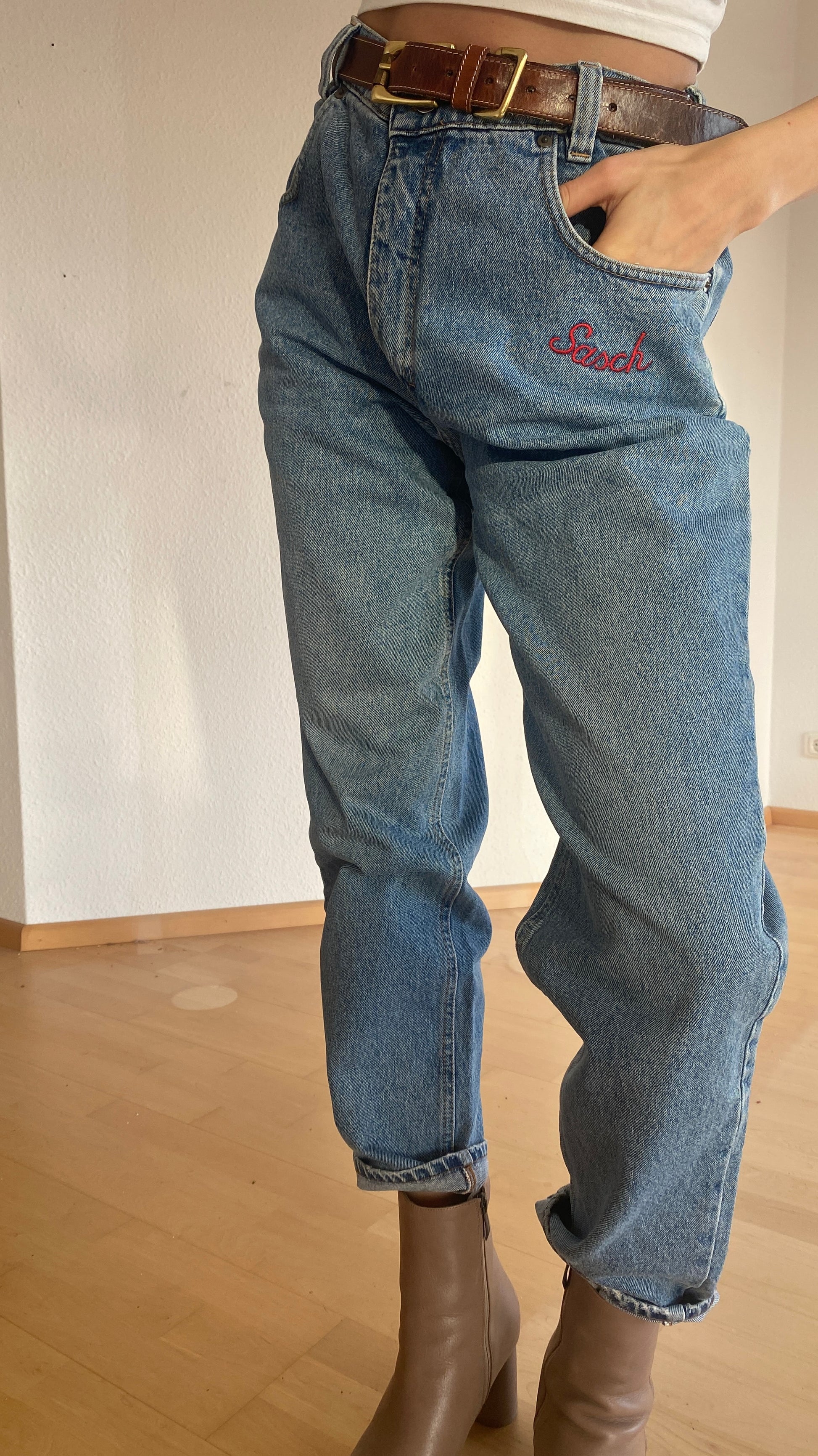 Vintage- Retro-Jeans der Marke Sasch (Italien), vermutlich aus den 1990er/2000er Jahren.