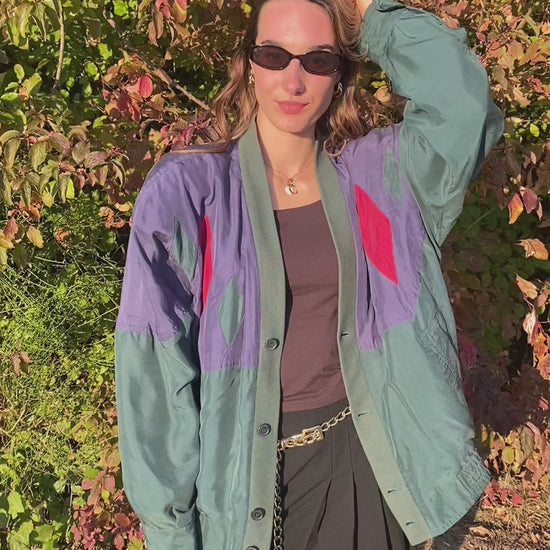 Seide Jacke Blouson Retro Farbmix grün blau rot, oversize, S,M,L,XL