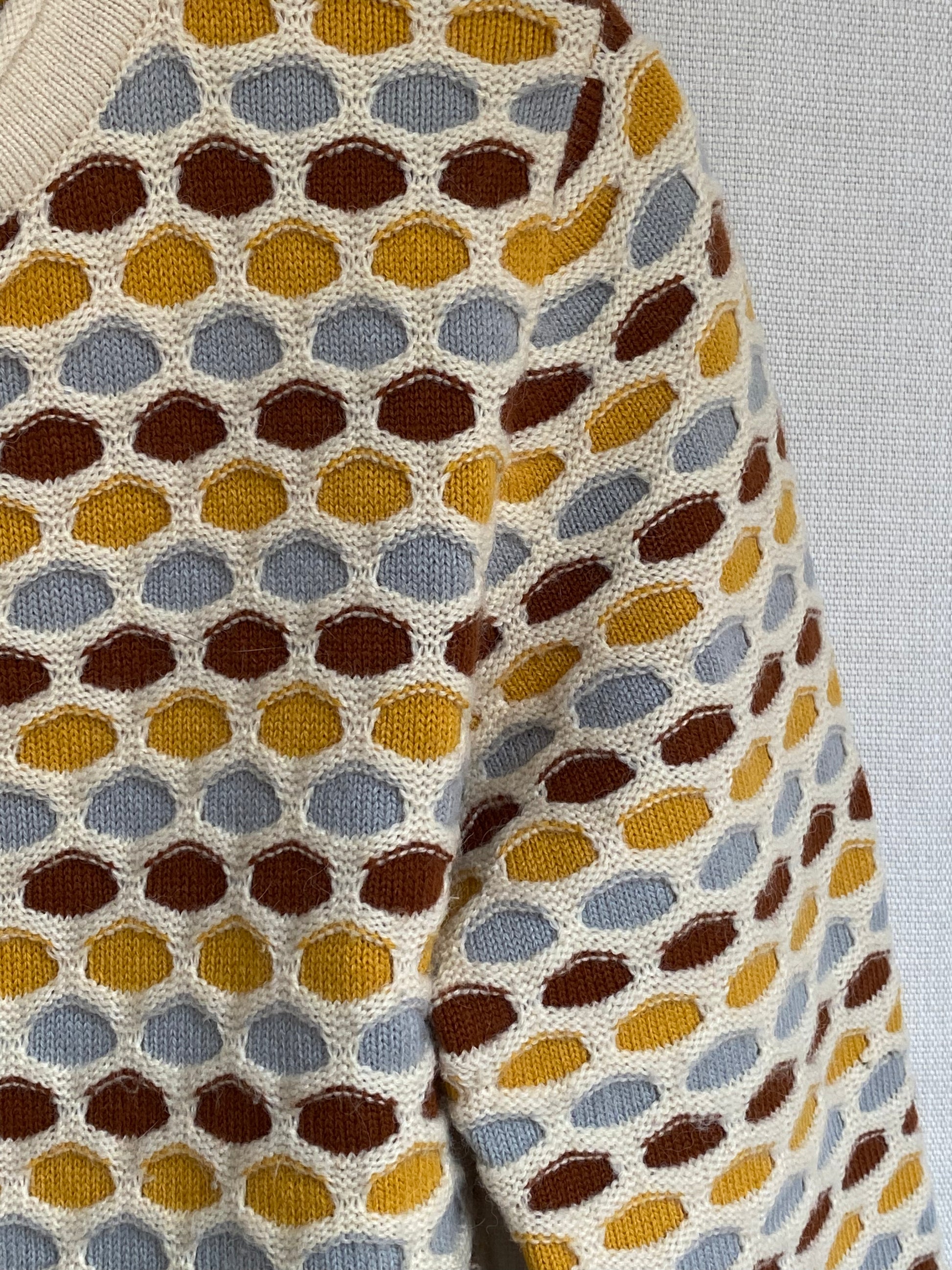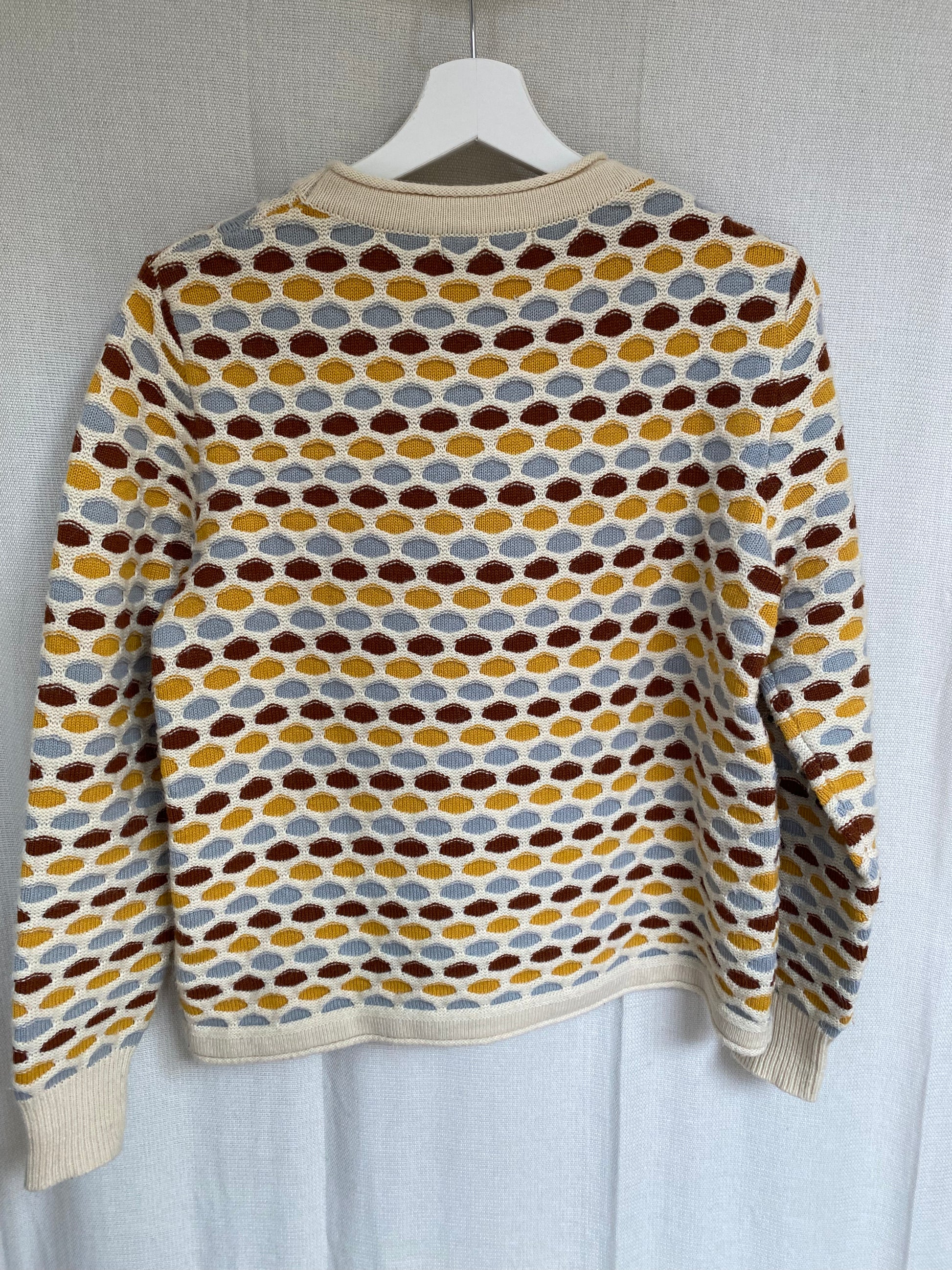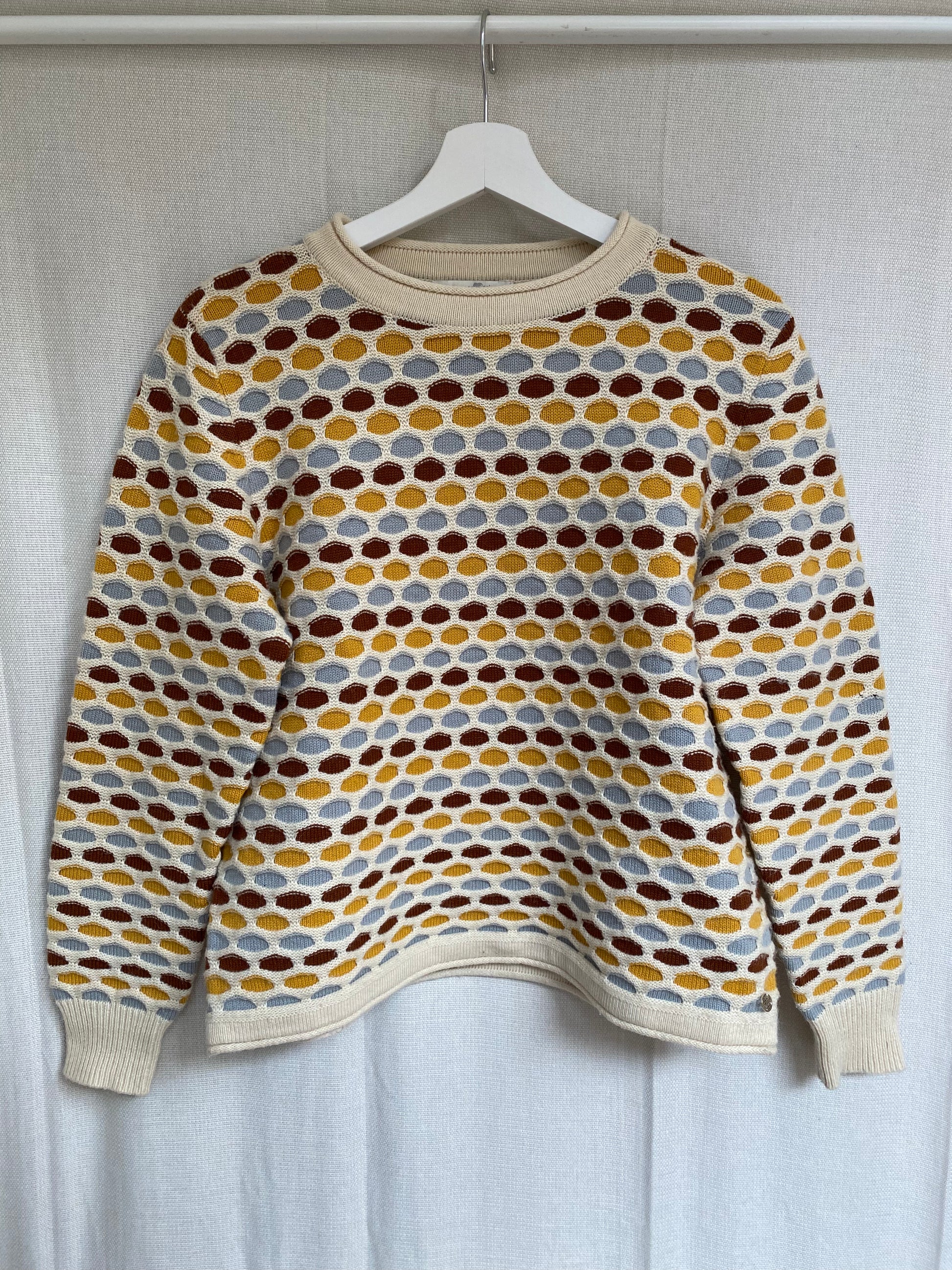 Hübscher Pullover in toller Creme Farbe beige mit multicolor bunten Farbakzenten in senfgelb weinrot bordeaux dunkelrot und hellblau