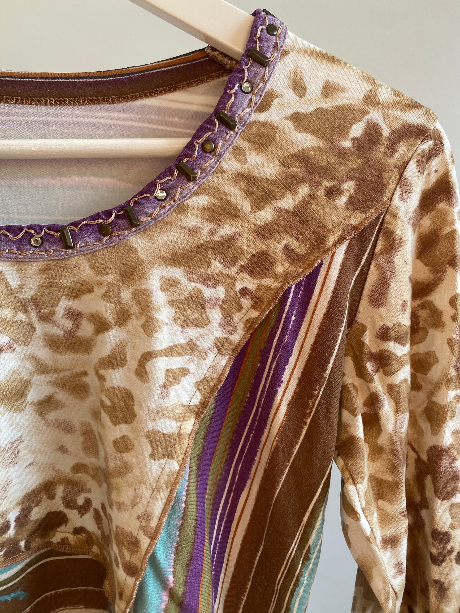 Buntes Muster braun beige mit animal Leo Print und lila tĂĽrkis braun grĂĽn Streifden-Muster; Mustermix; 3D Verzierung BlumeÂ