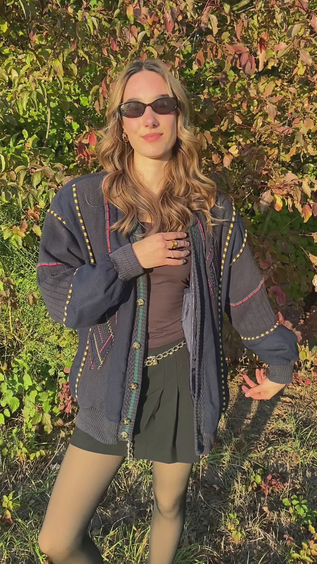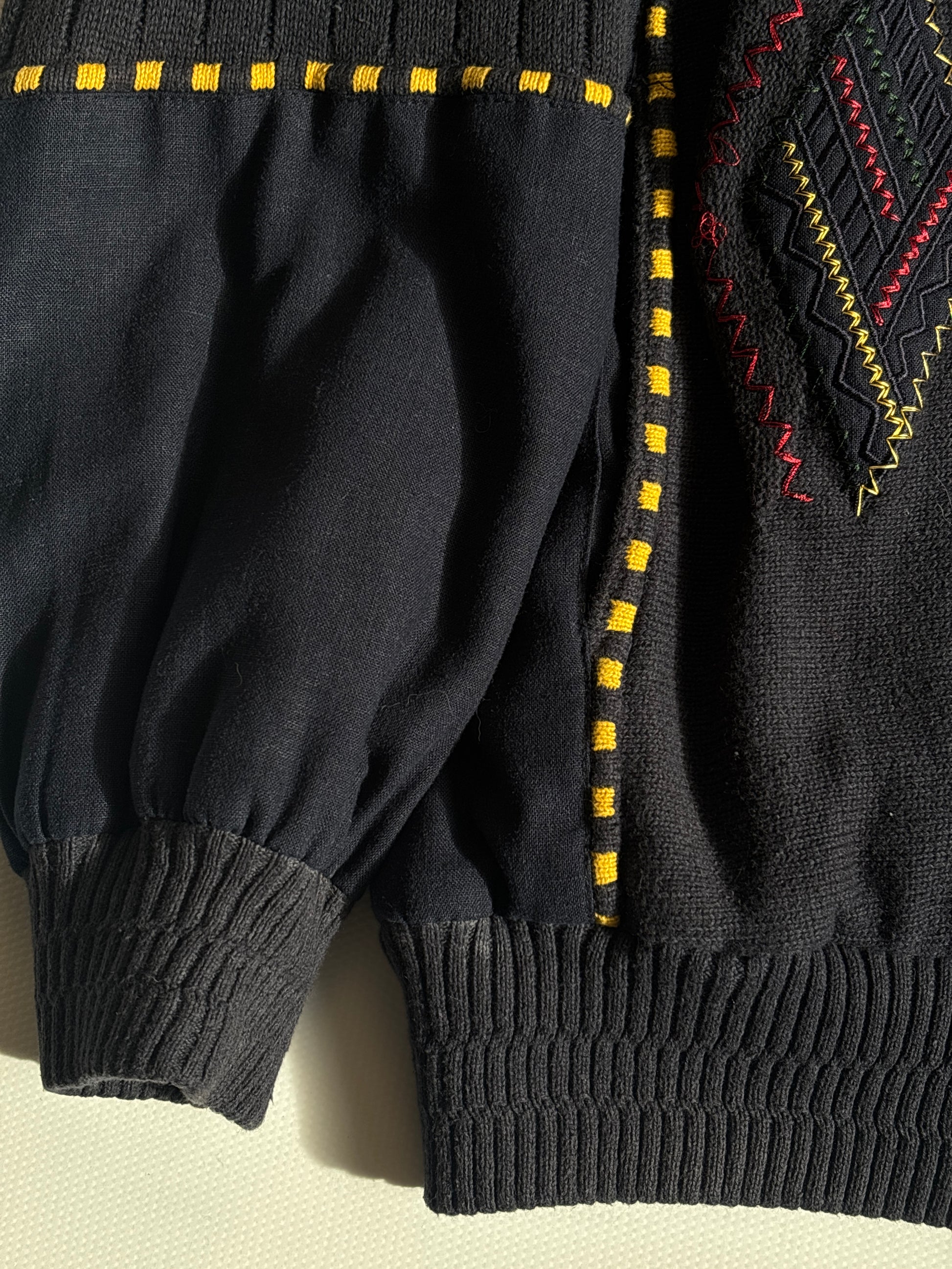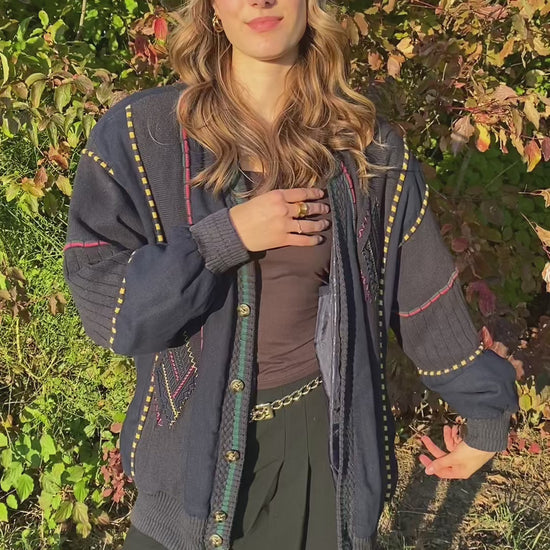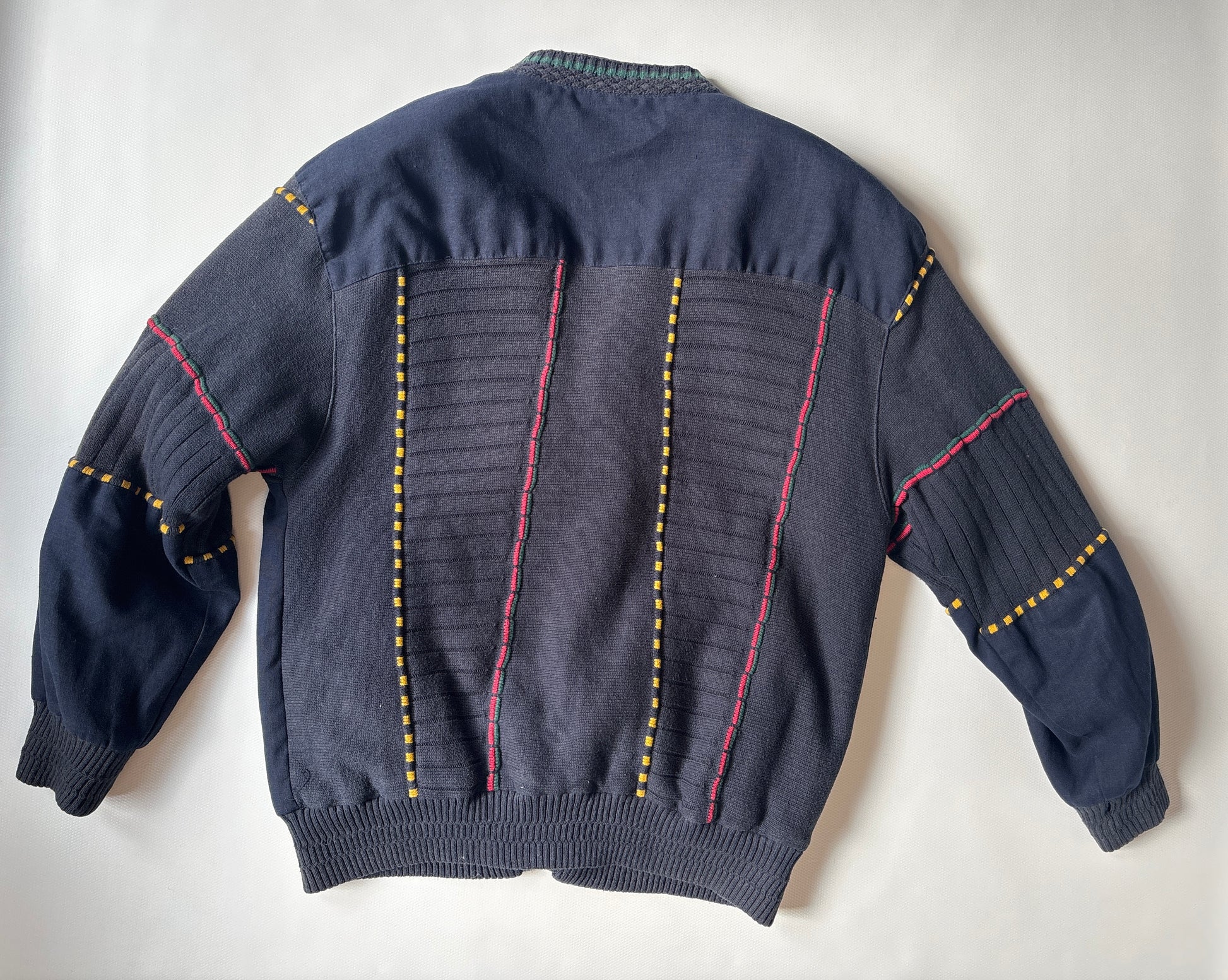 Retro Stück, tolle Jacke aus Baumwolle Leinen Mix mit Polyester und 3D Strick knitted Pattern Linienmuster bunt mehrfarbig multicolor auf schwarz dunkelblau navy marine